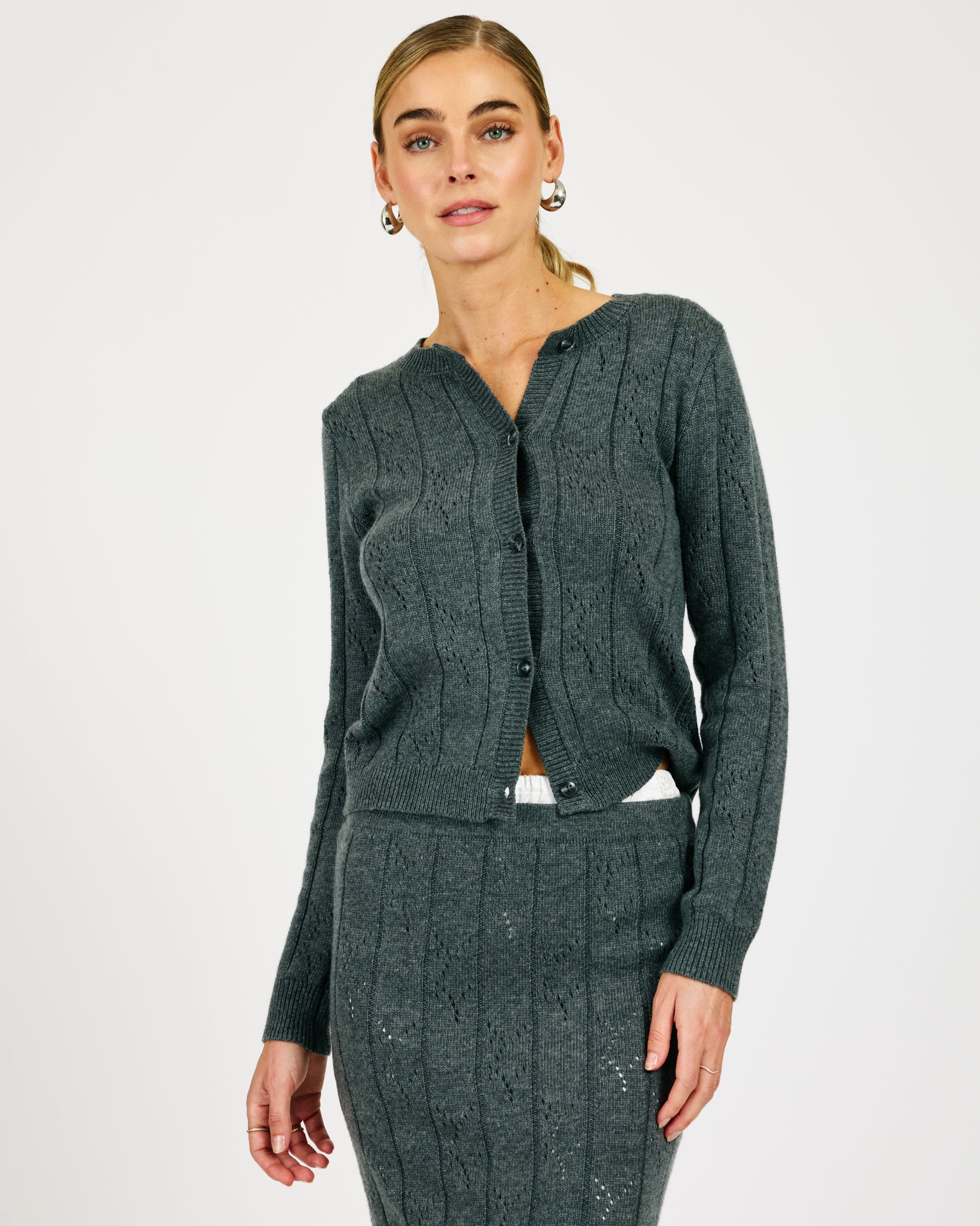 - Mid-weight pointelle knit sweater fabric- Round neckline- Long sleeves- Button placket