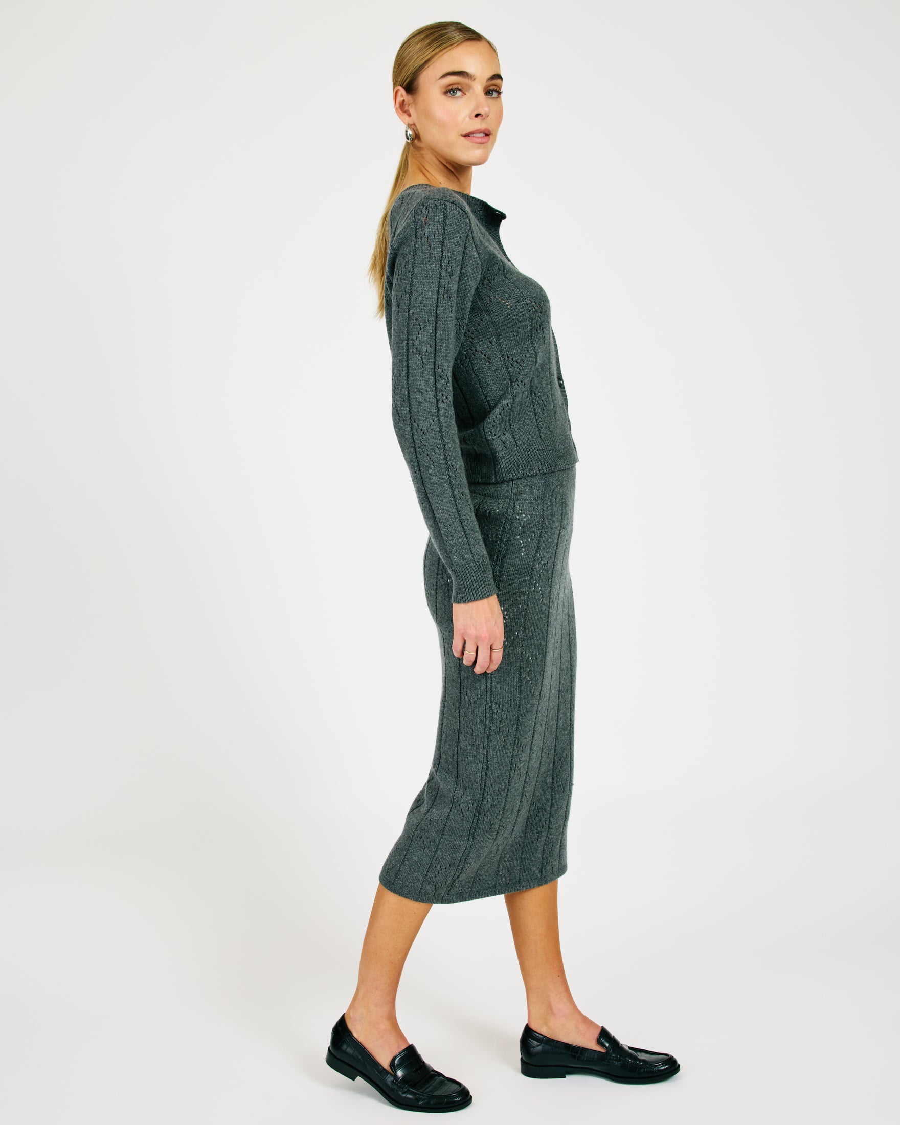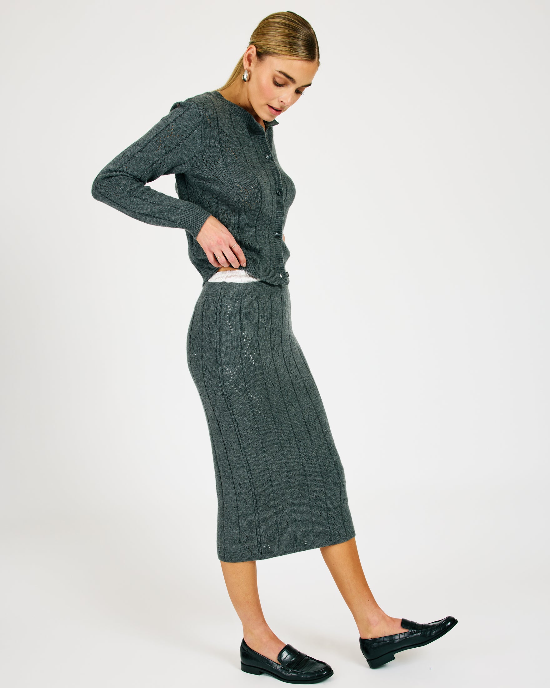 - Mid-weight pointelle knit sweater fabric- Midi length- Self covered elastic band- Contrast slip skirt inside