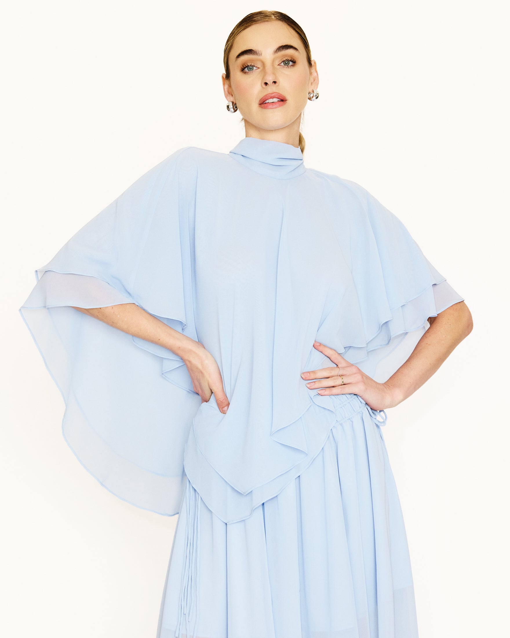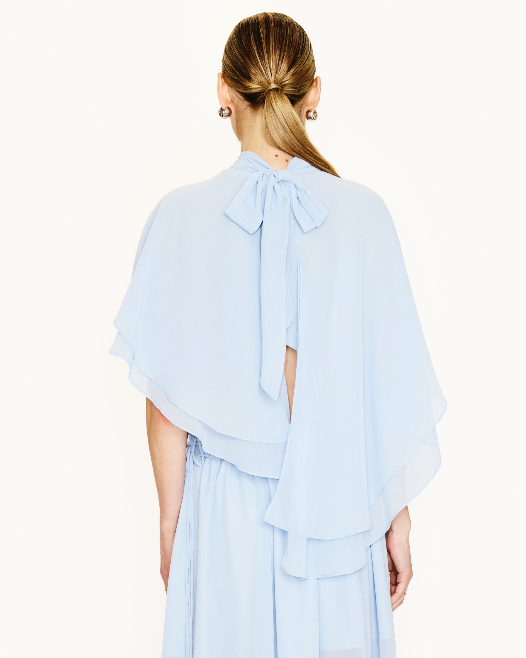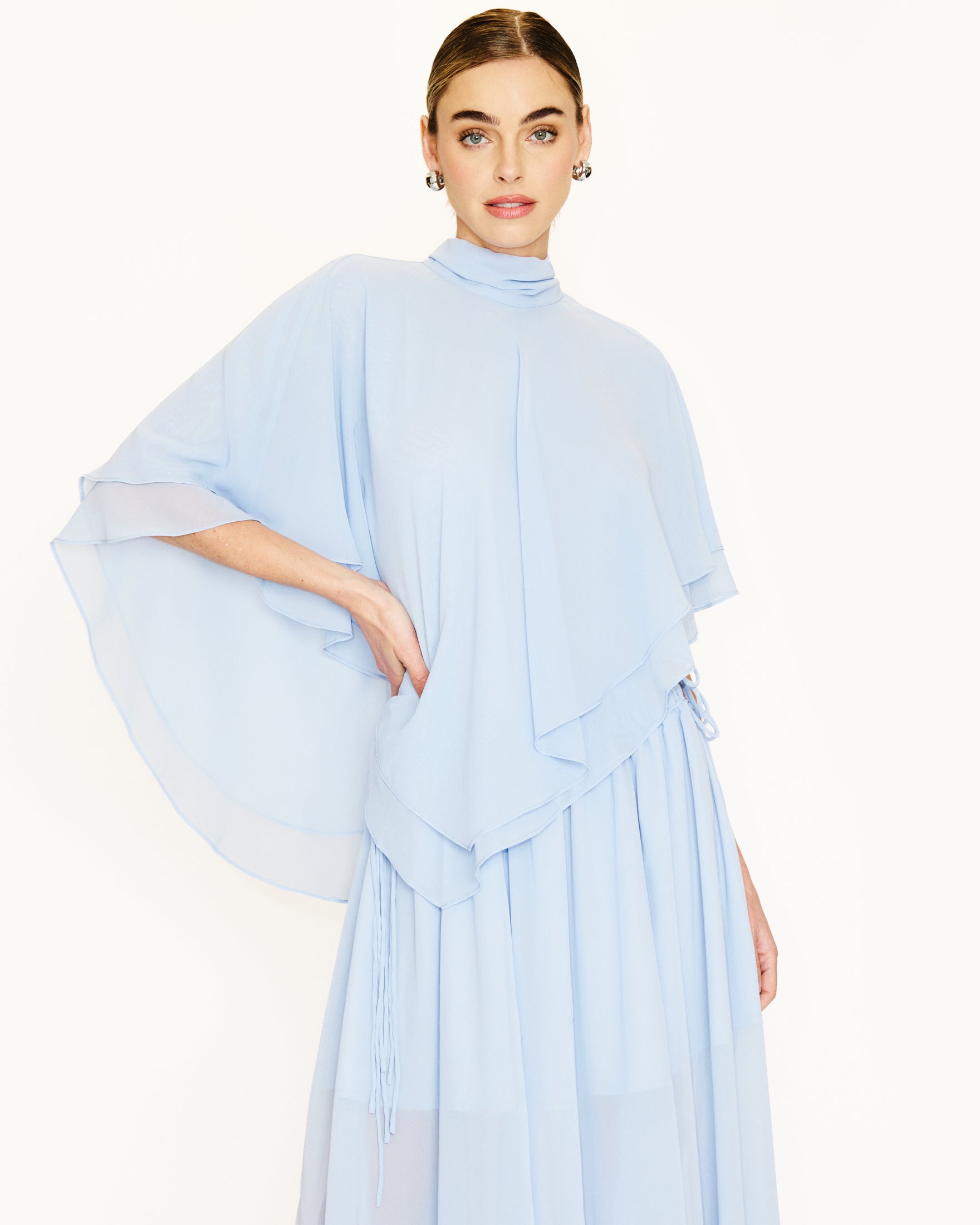 - Draping cape design - Mockneck - Tie back - Dettachable camisole lining