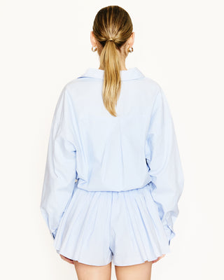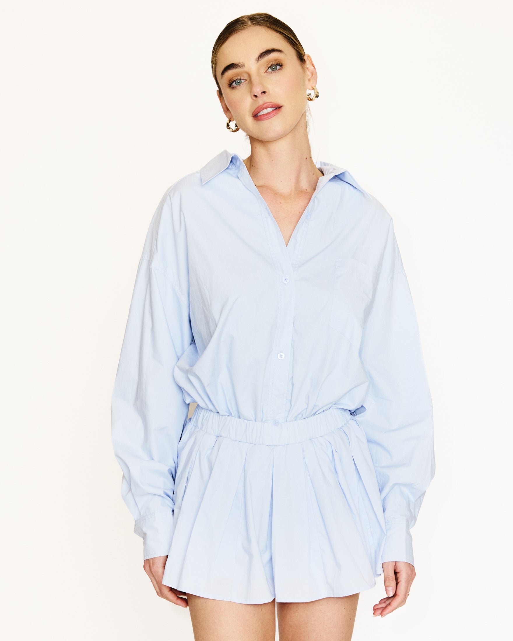 - Mid-weight non-stretch poplin fabric - Collared neckline - Long sleeves - Front button placket - Self-covered elastic waistband - Fully Lined
