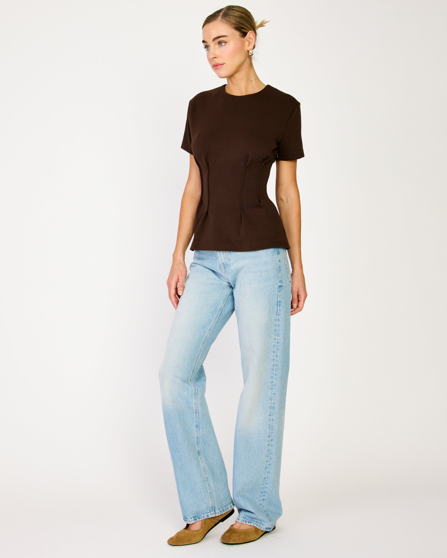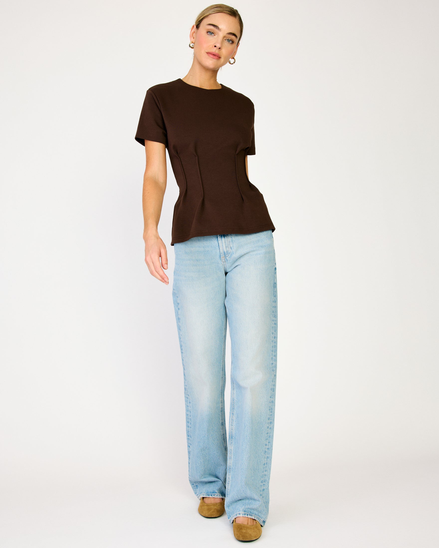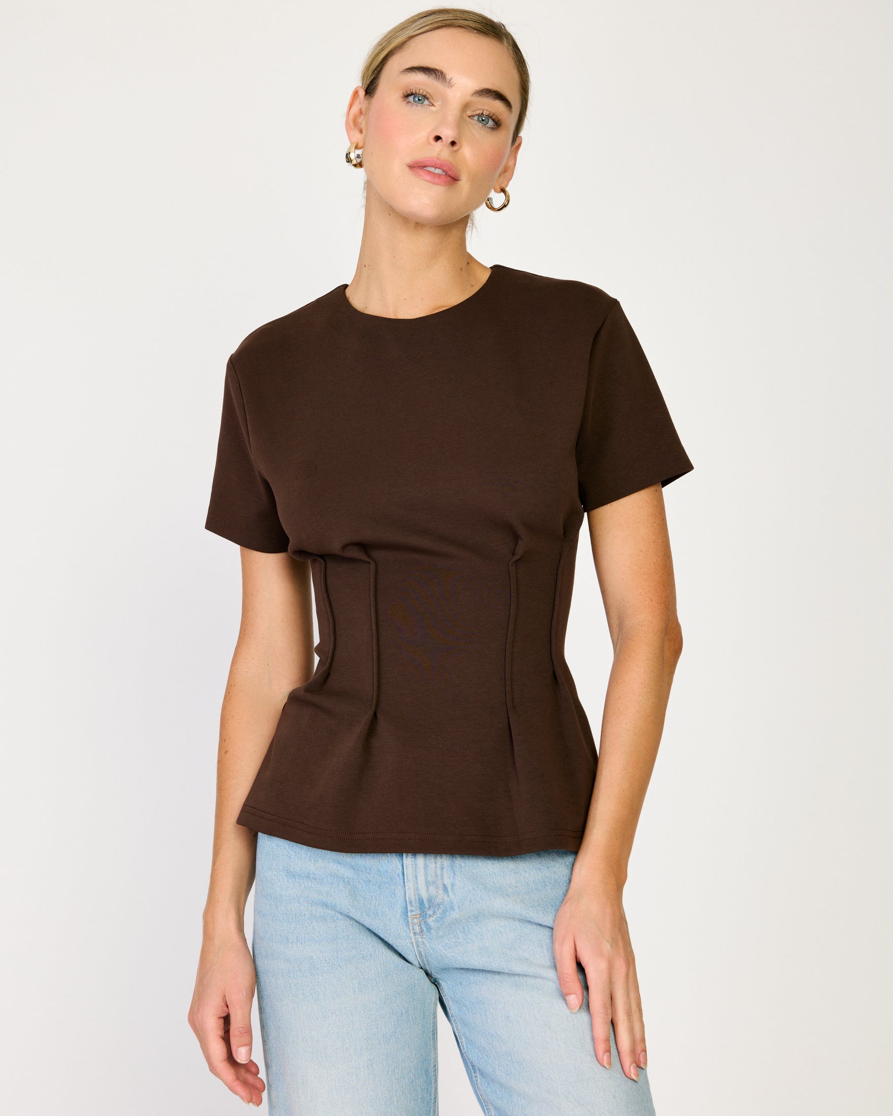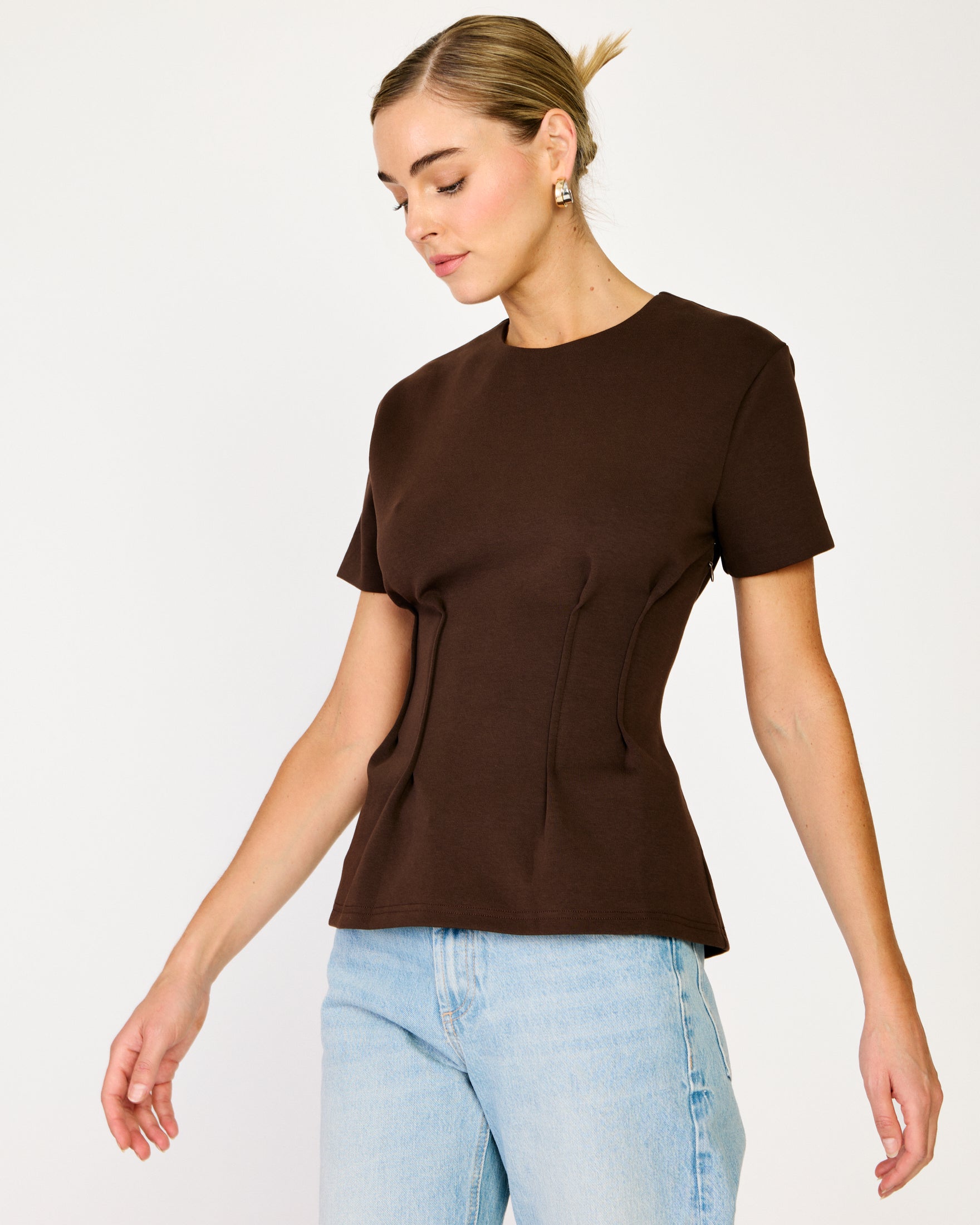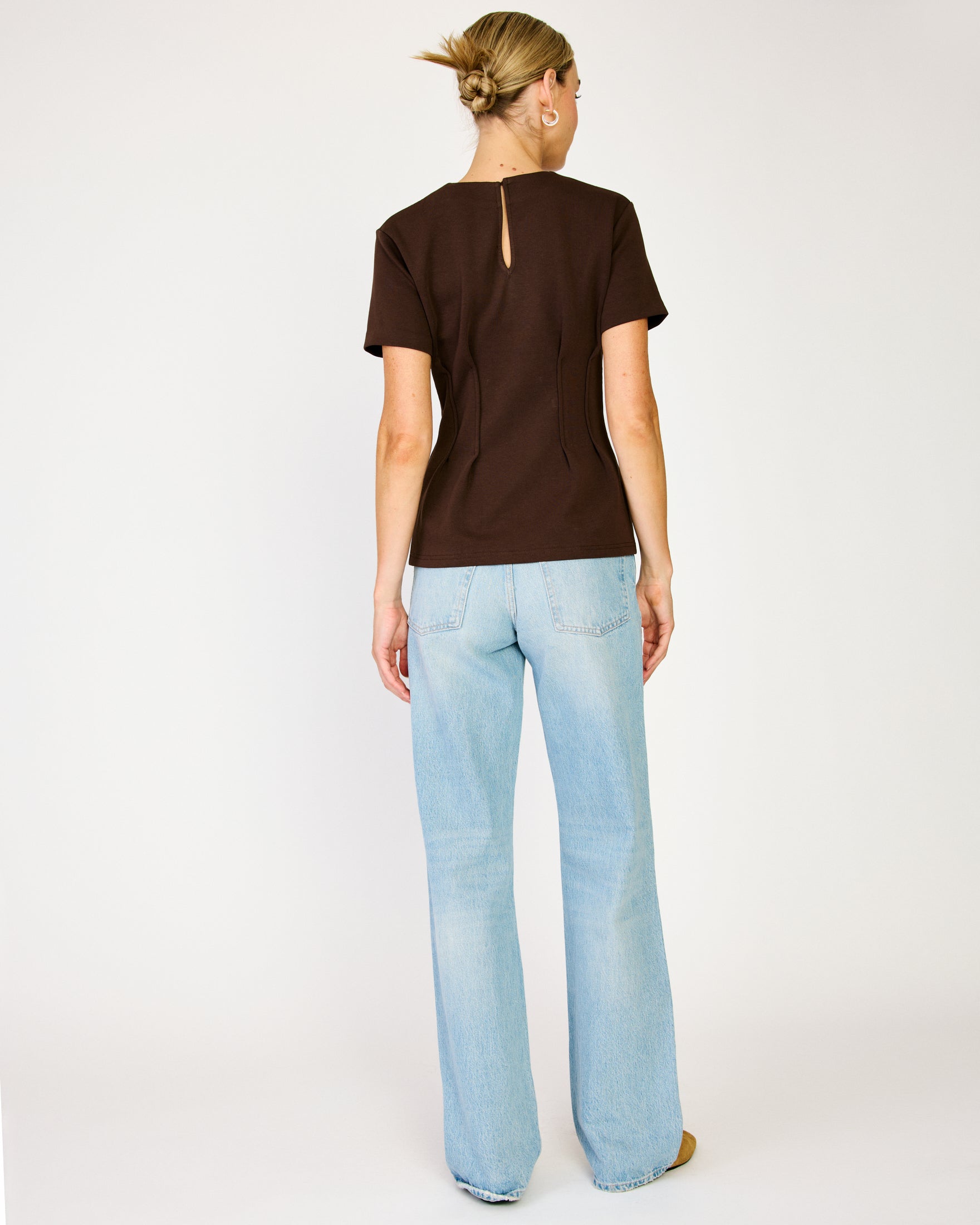 - Mid-weight stretch woven fabric- Round neckline- Short sleeves- Fitted waist- Keyhole at back with elastic button and hidden button