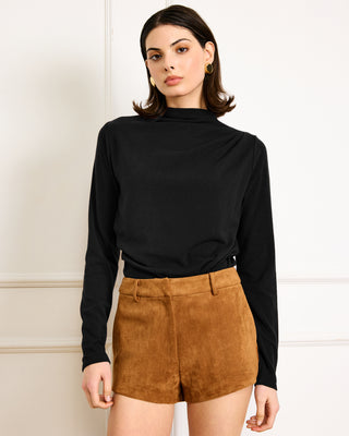 - Midweight stretch knit jersey fabric- Mock Neck- Draping detail- Long sleeves