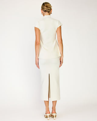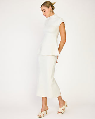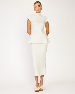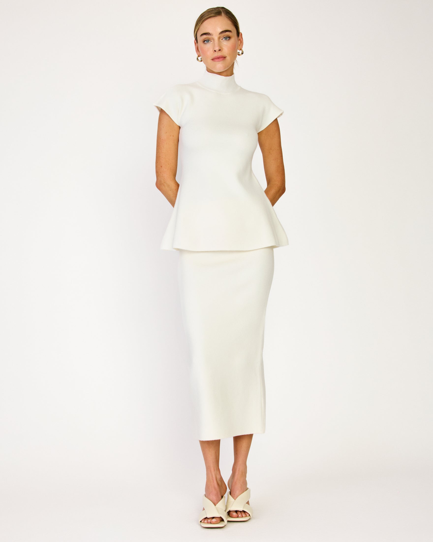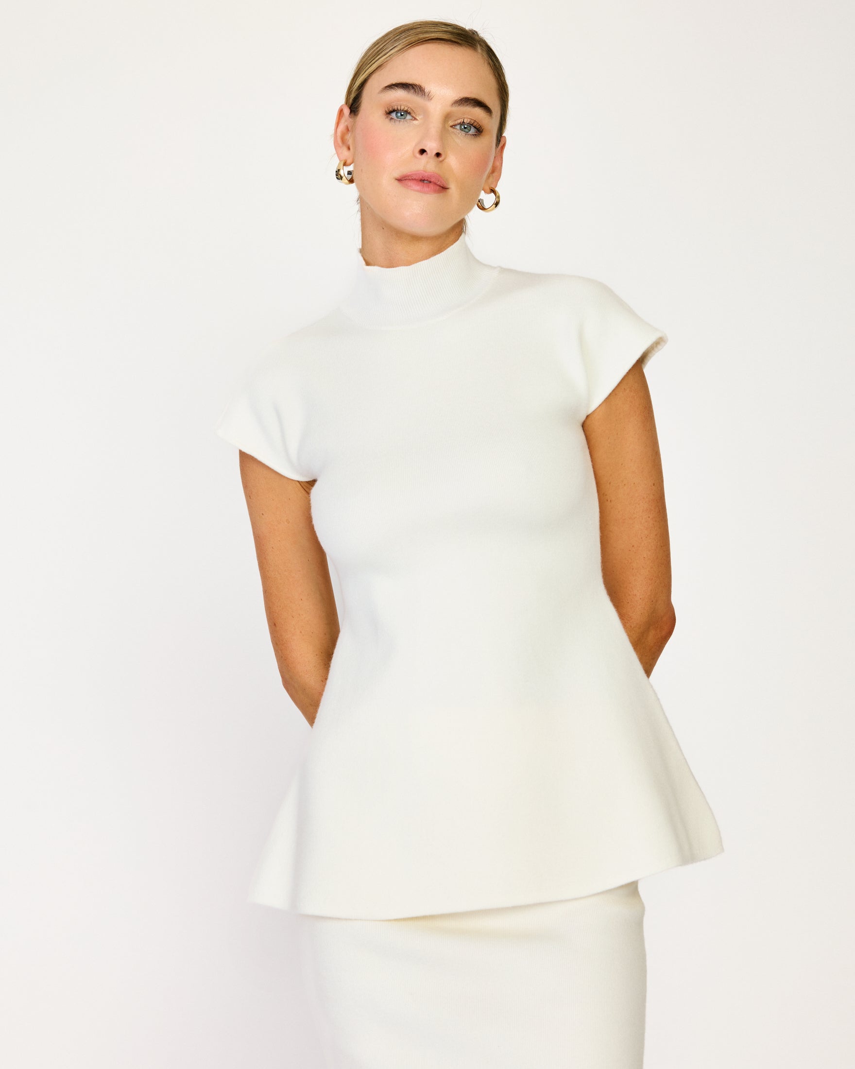 - Heavy-weight knit sweater - Hourglass silhouette - Mock Neck - Short cap sleeves - Peplum design