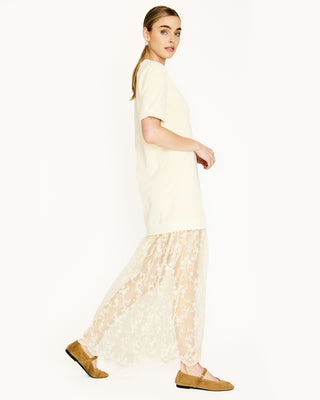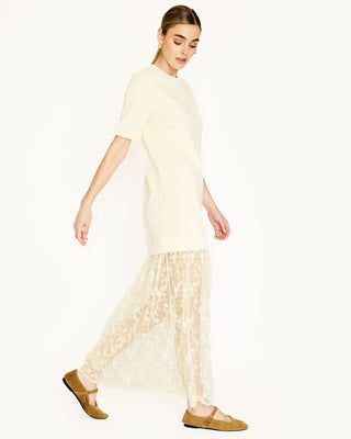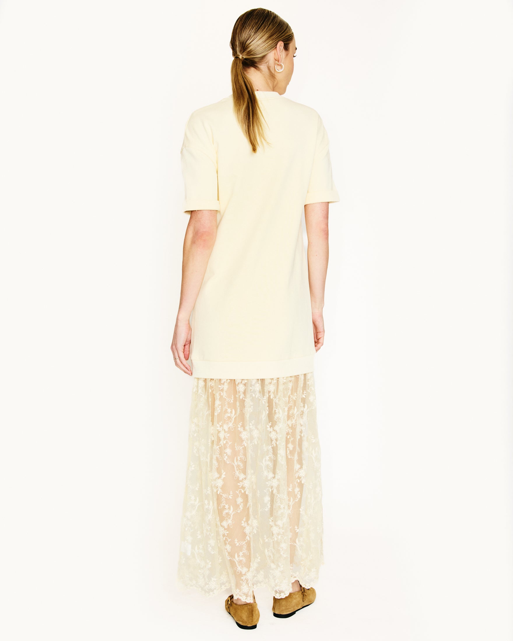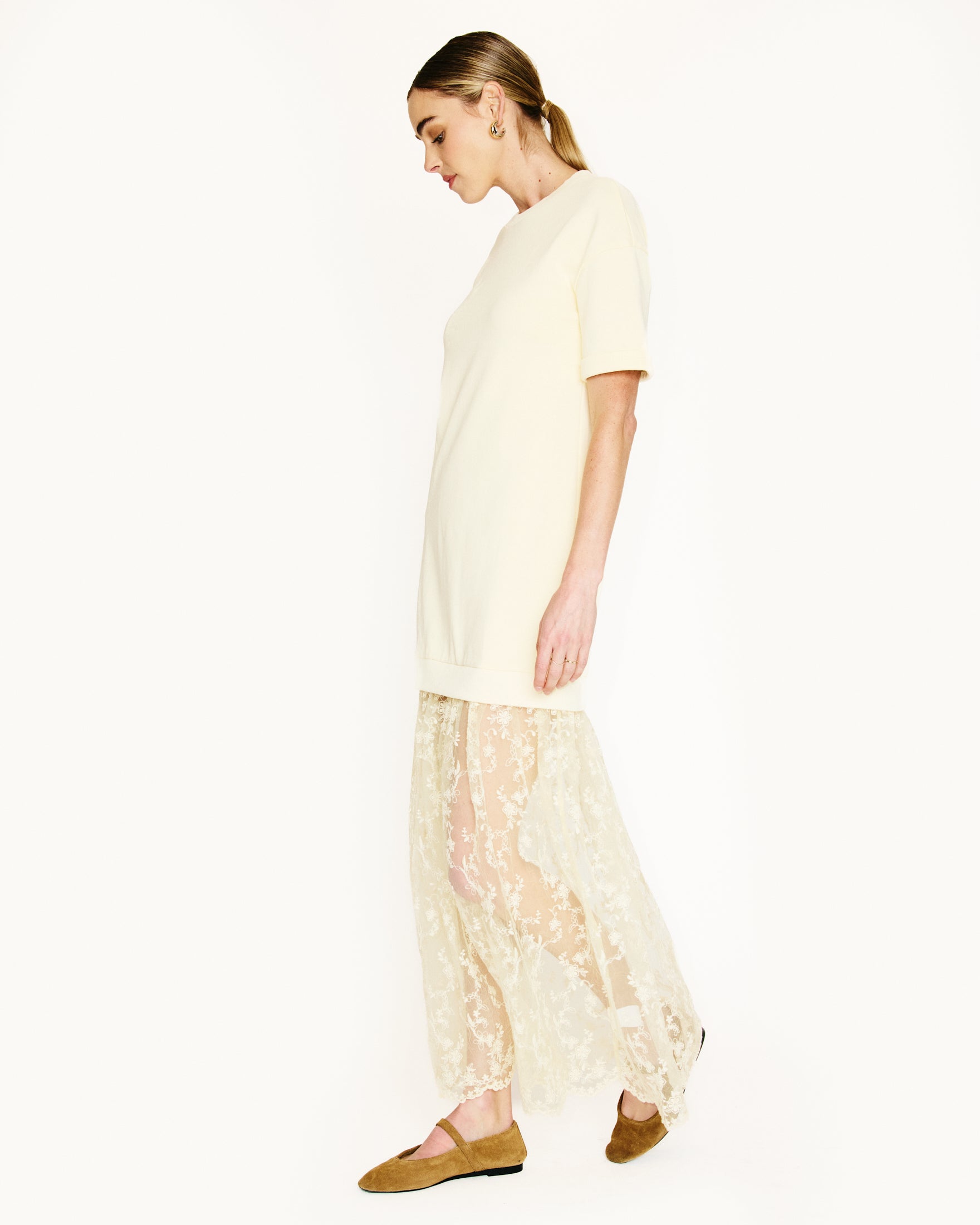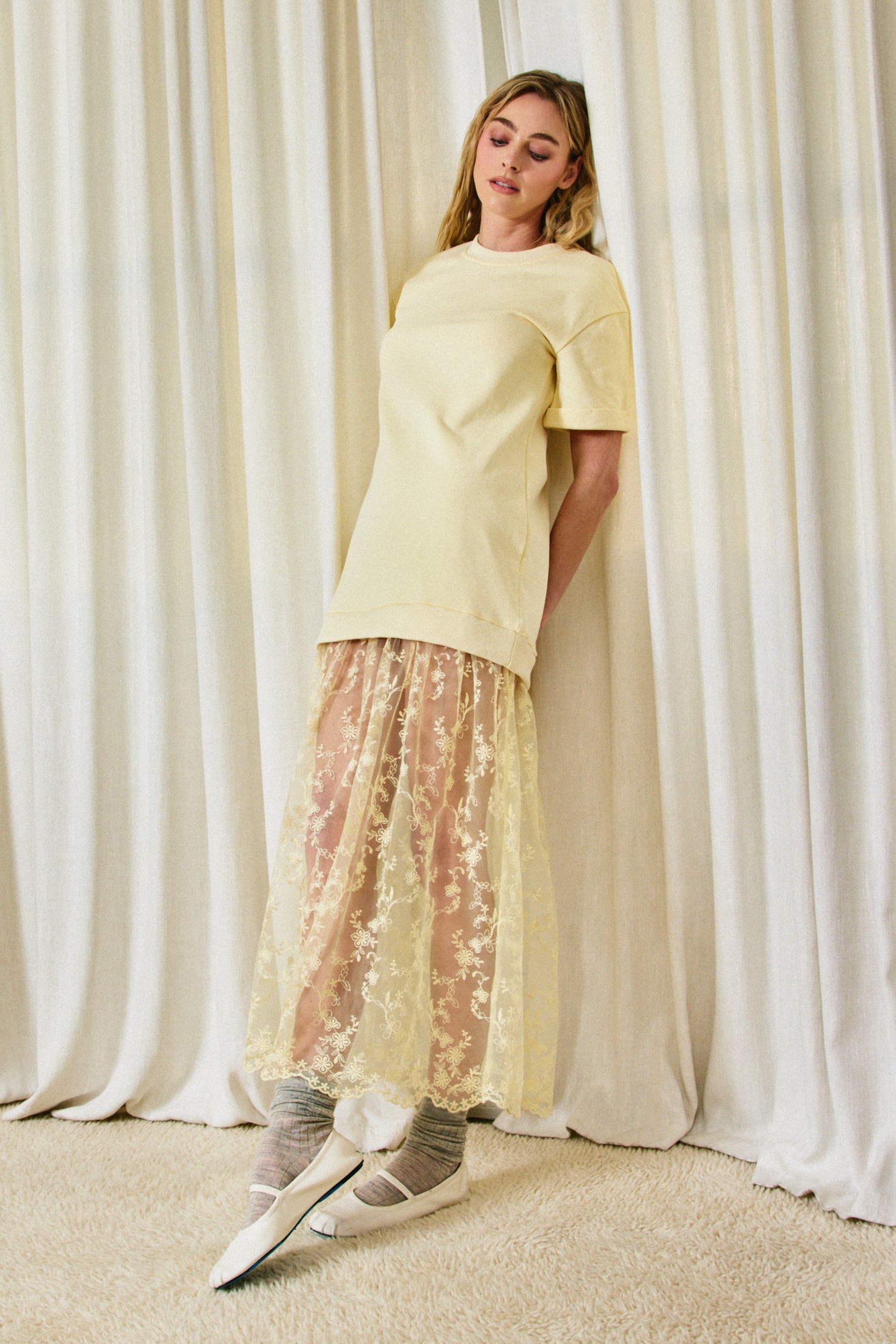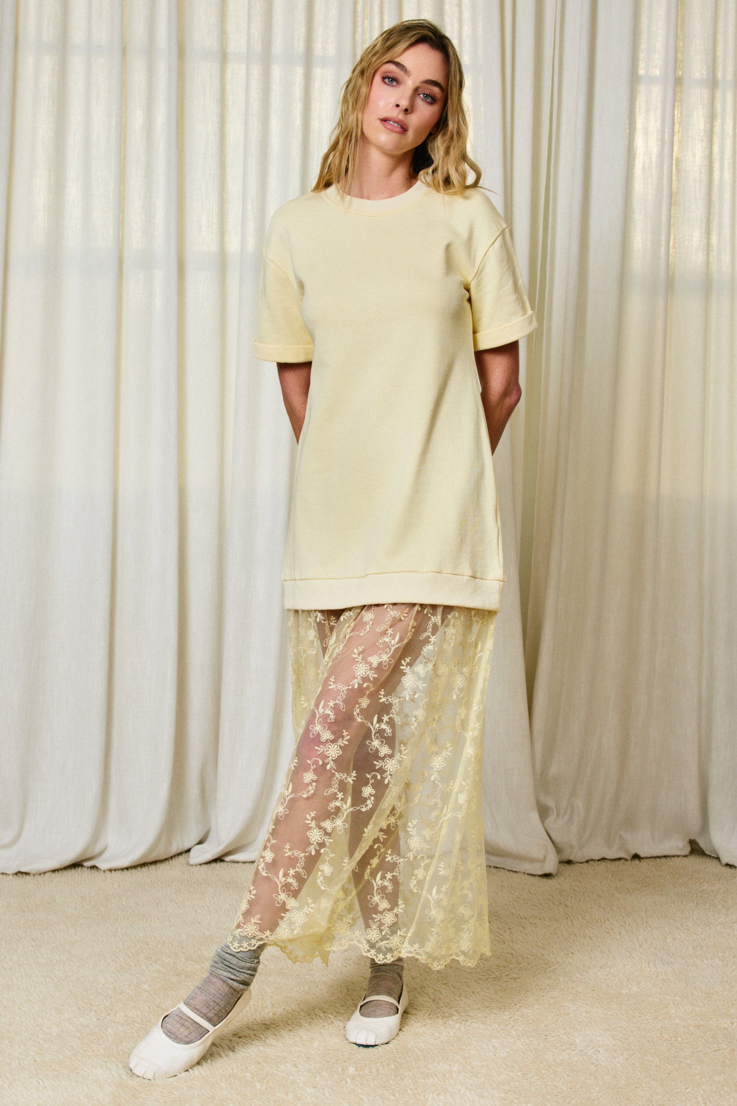 - Mid-weight french terry fabric - Pull-on design - Short sleeves - Lace contrast skirt designed intentionally sheer