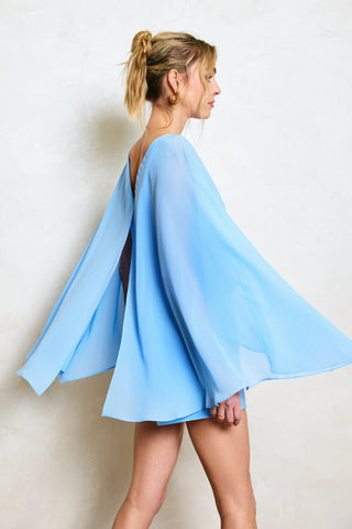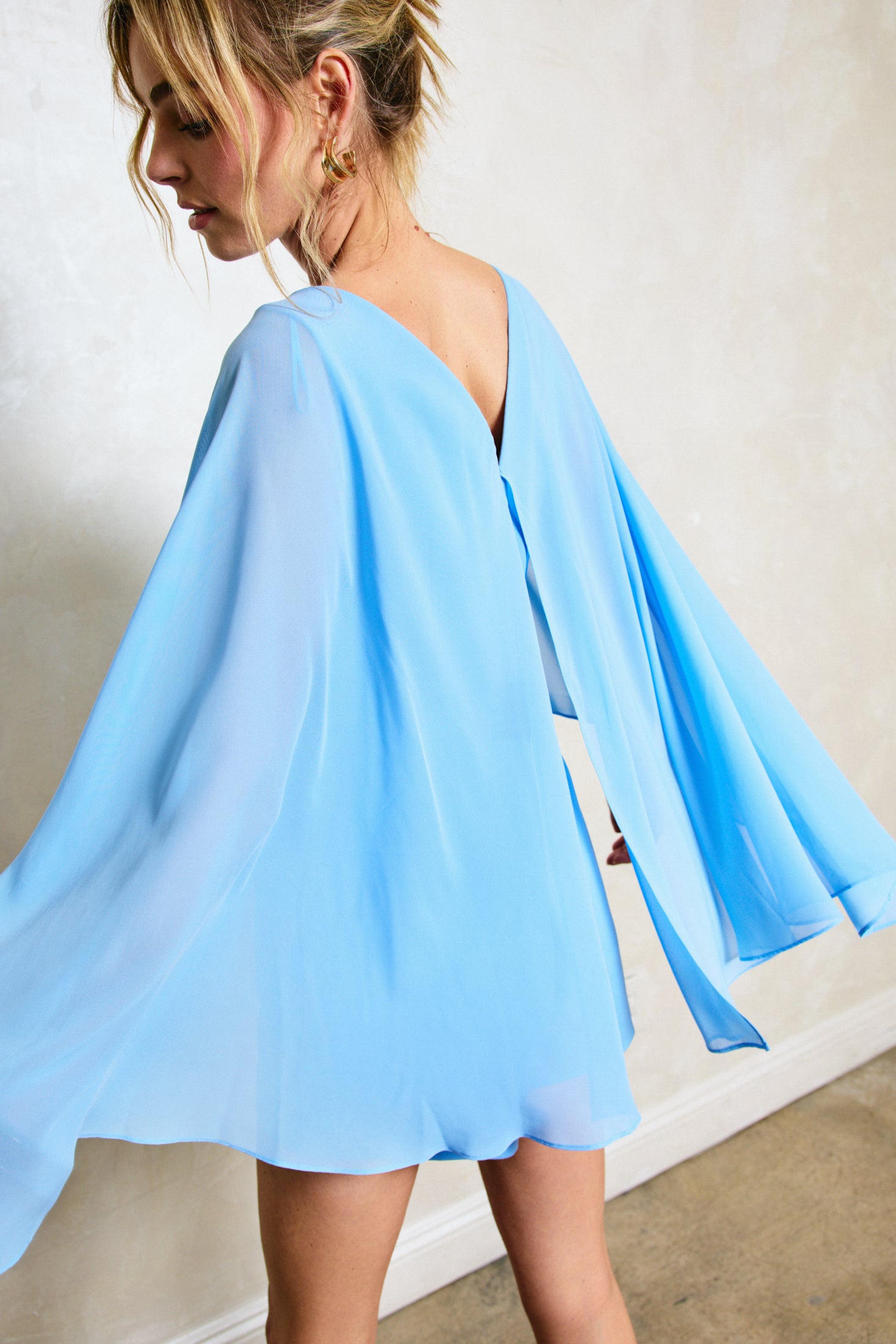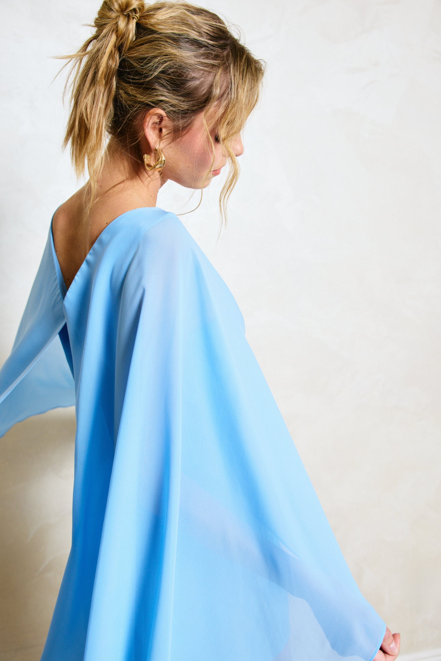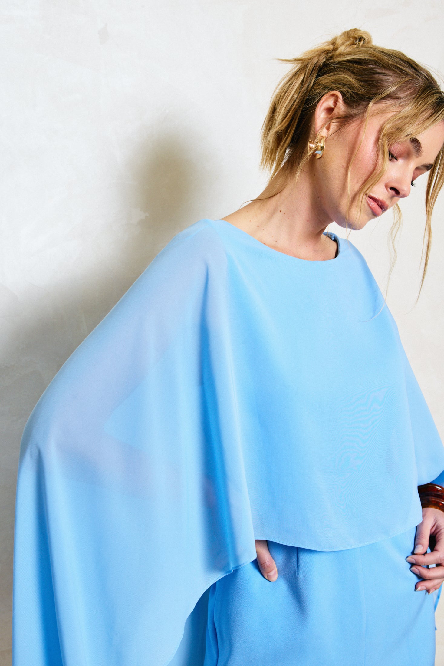 - Mid-weight non-stretch fabric- Light-weight non-stretch chiffon contrast cape - Hidden pocket at side seam - Hook-and-eye and concealed zipper at center back- Lined