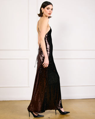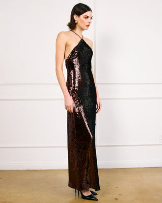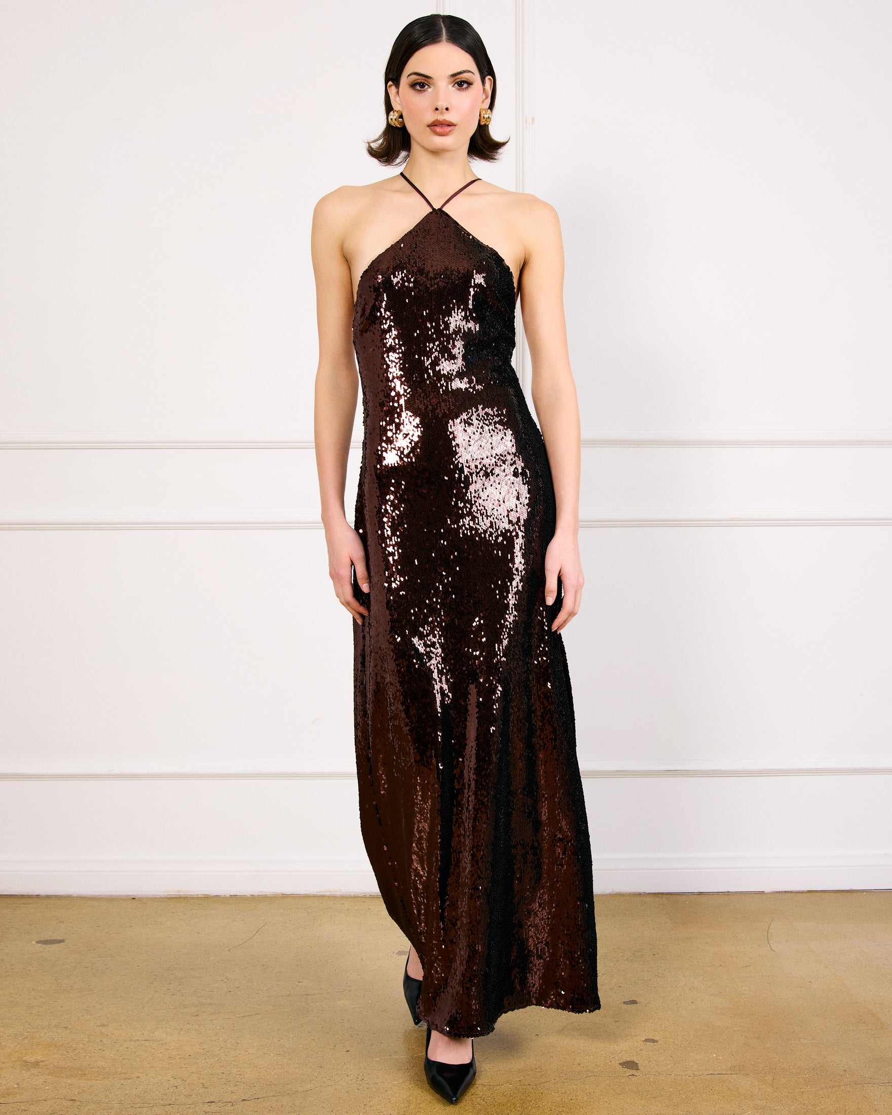 - Mid-weight sequins embellished mesh fabric- Halter neckline- Sleeveless - Zipper at center back- Fully lined