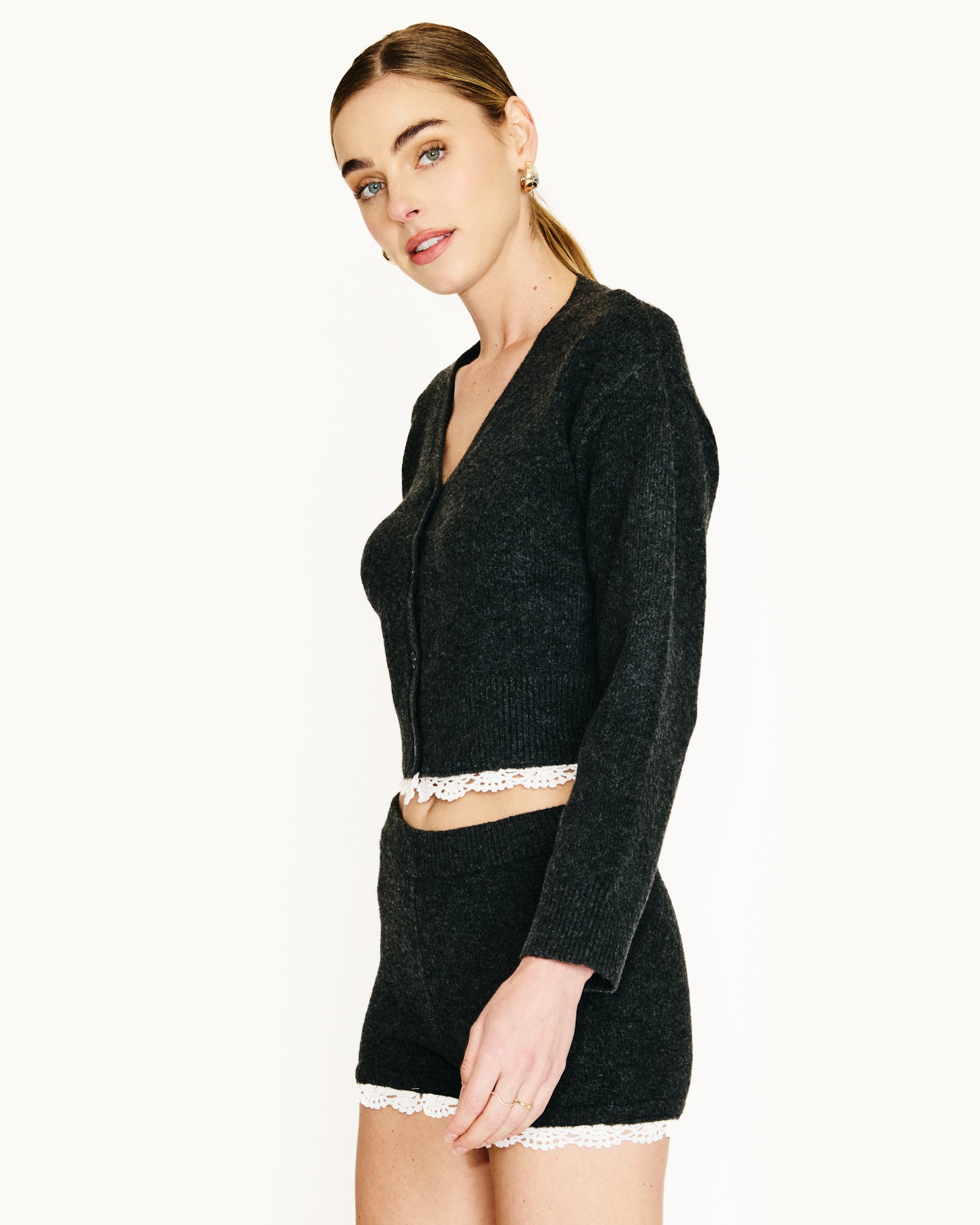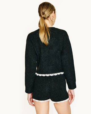 - Mid-weight knit sweater fabric - Covered elastic inserted waistband - Lace trim detail along the hem