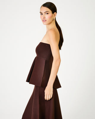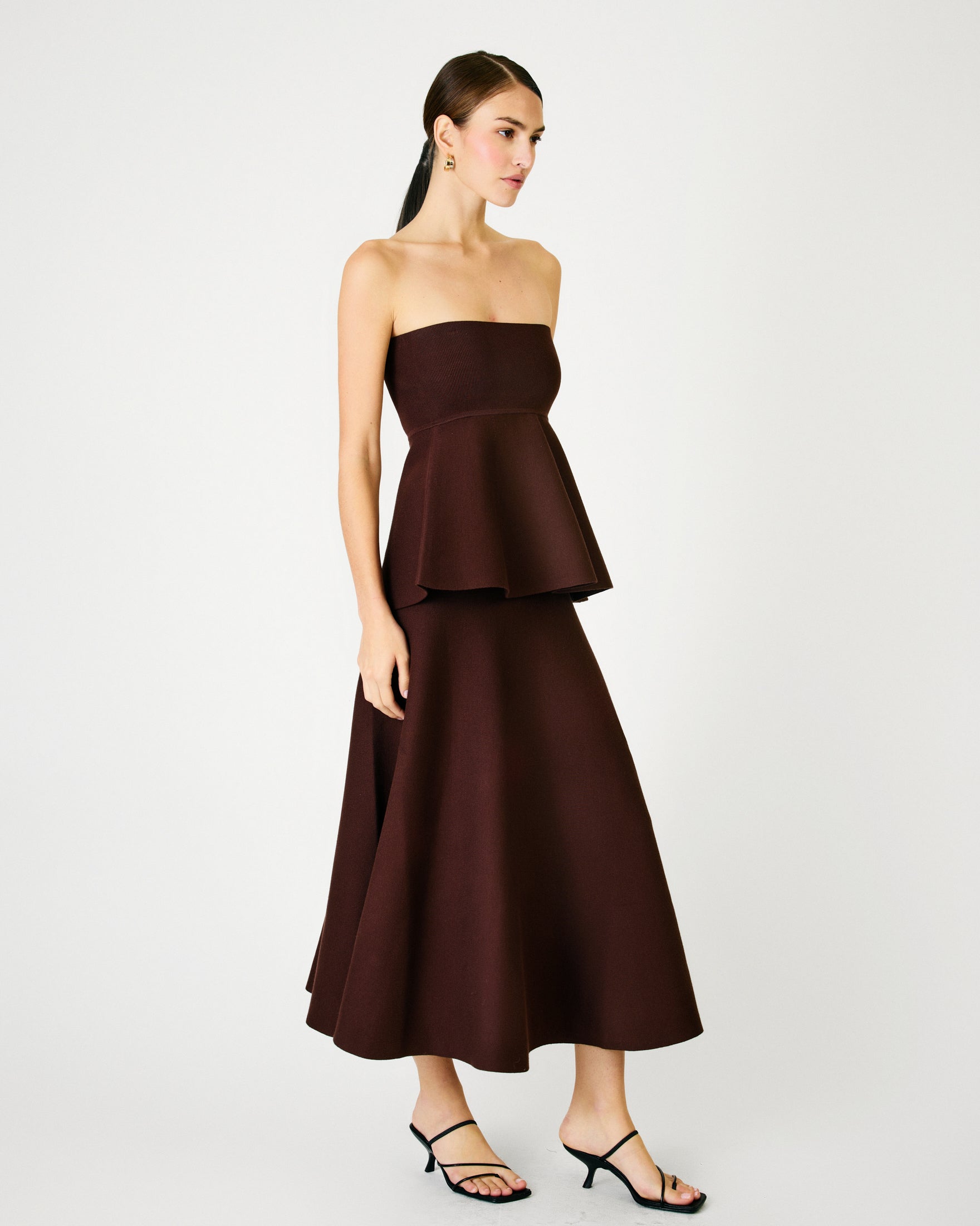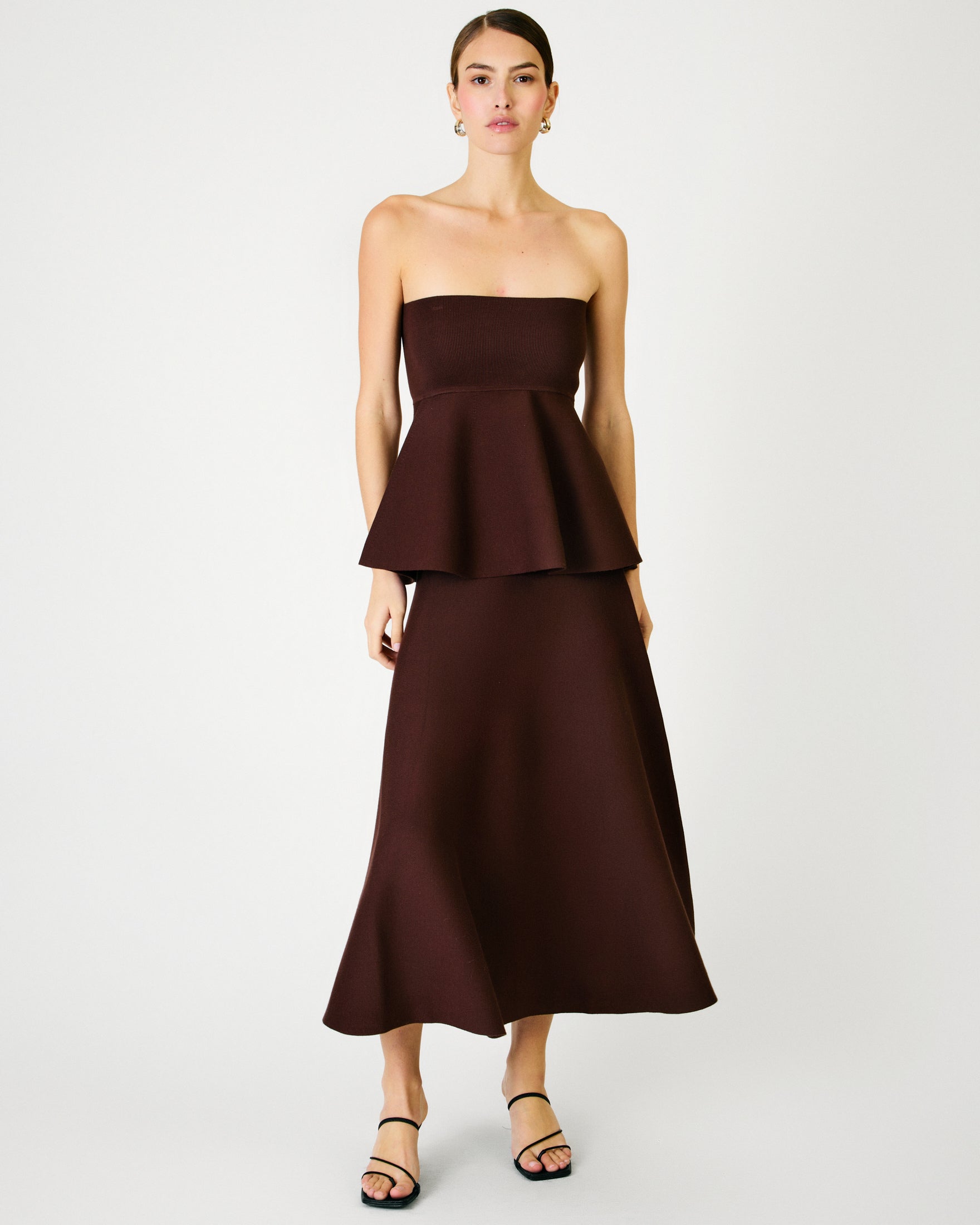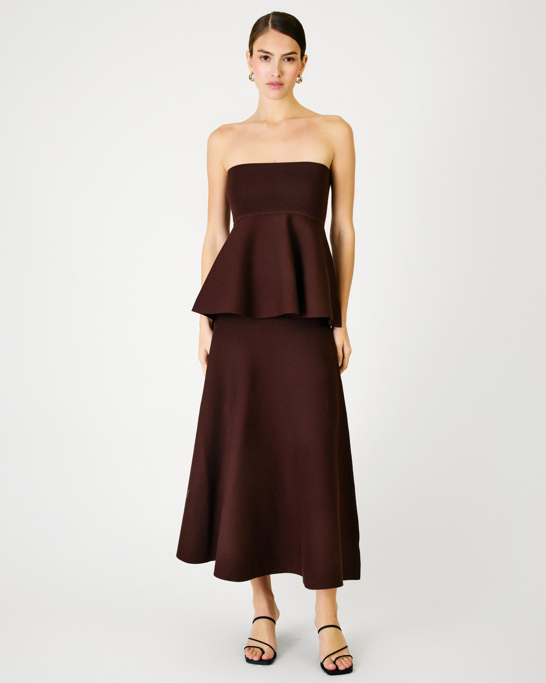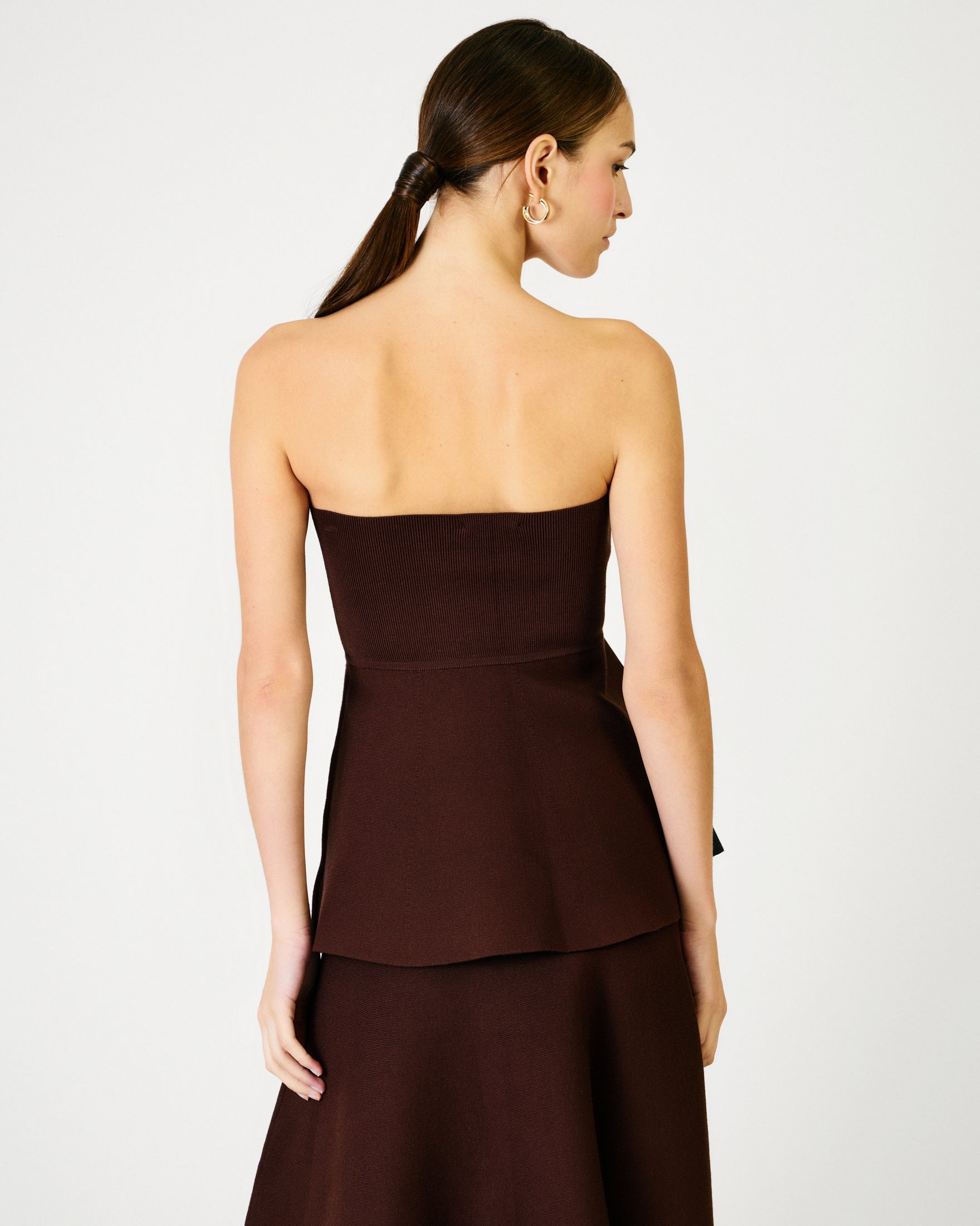 - Mid-weight rib knit sweater fabric- Strapless- Sleeveless- Peplum design- Pullover design, no closure