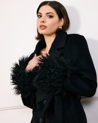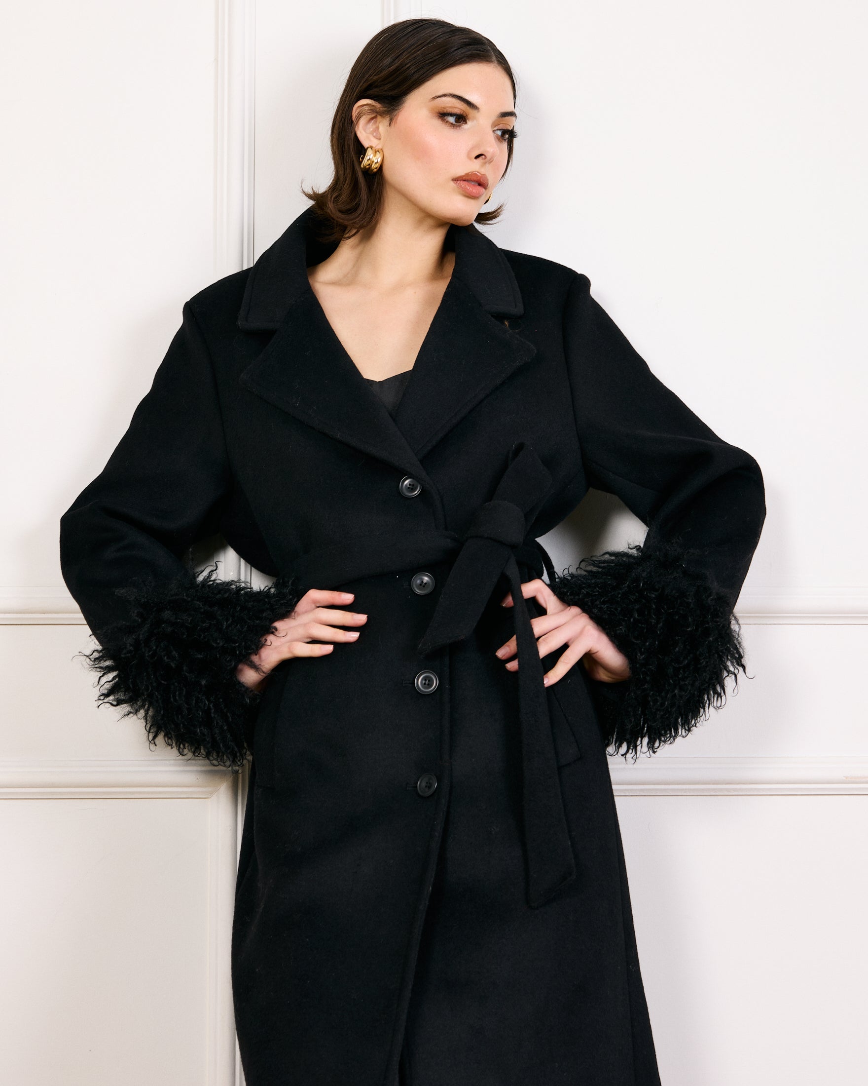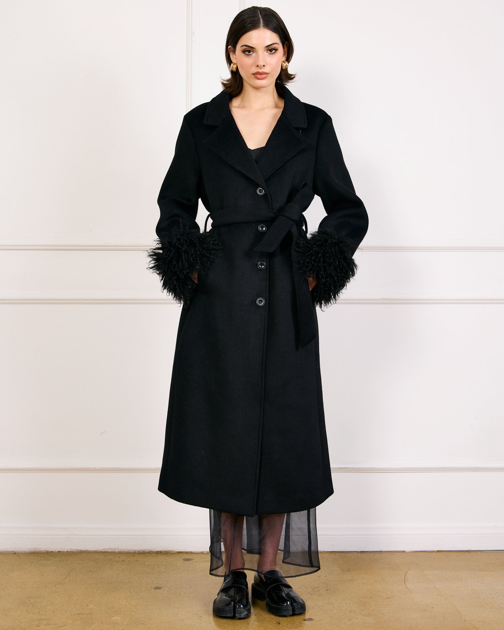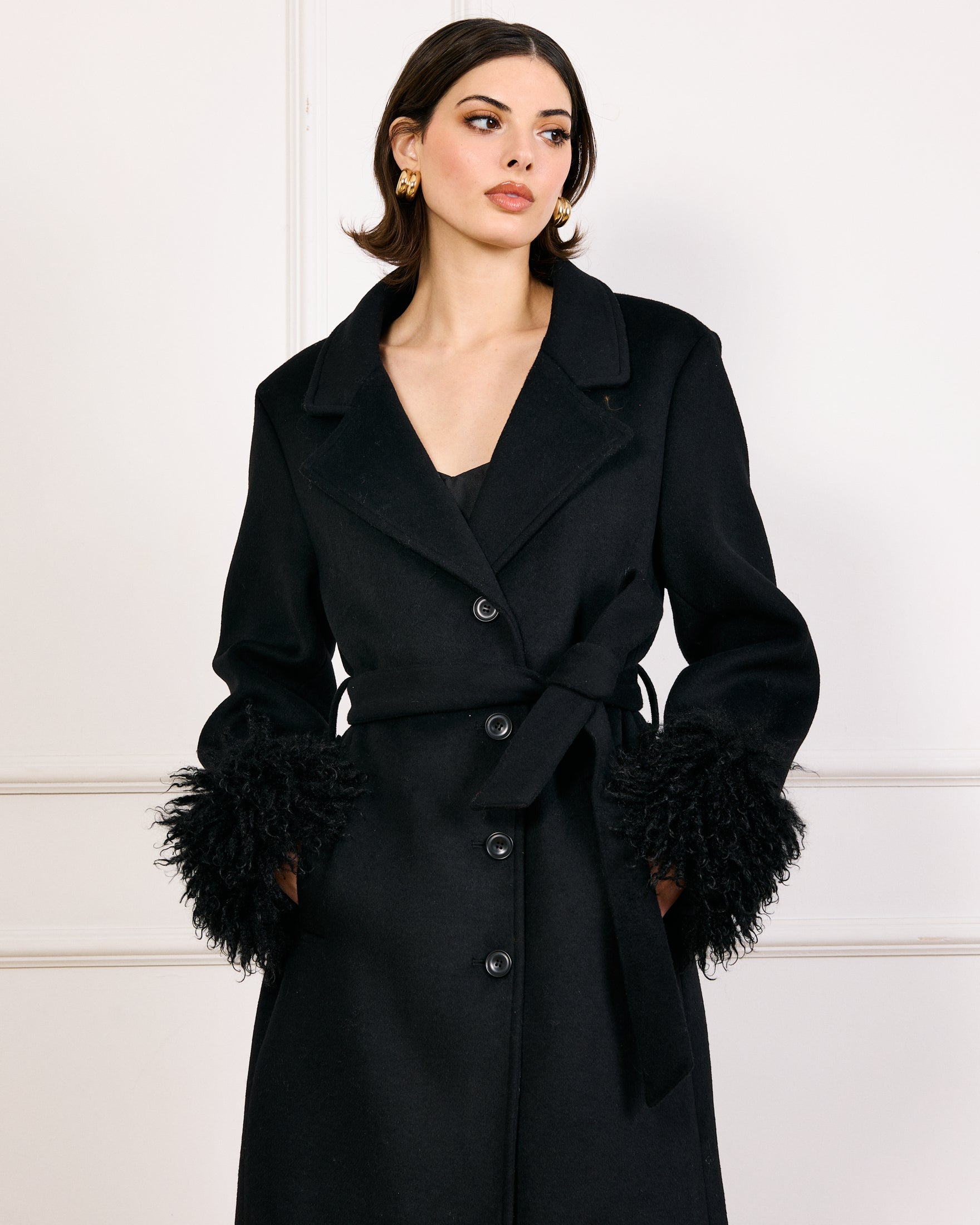 - Mid-weight woo blend felt fabric- Notched lapel- Long sleeves with faux mongolian faux fur detail- Detachable belt - Fully lined