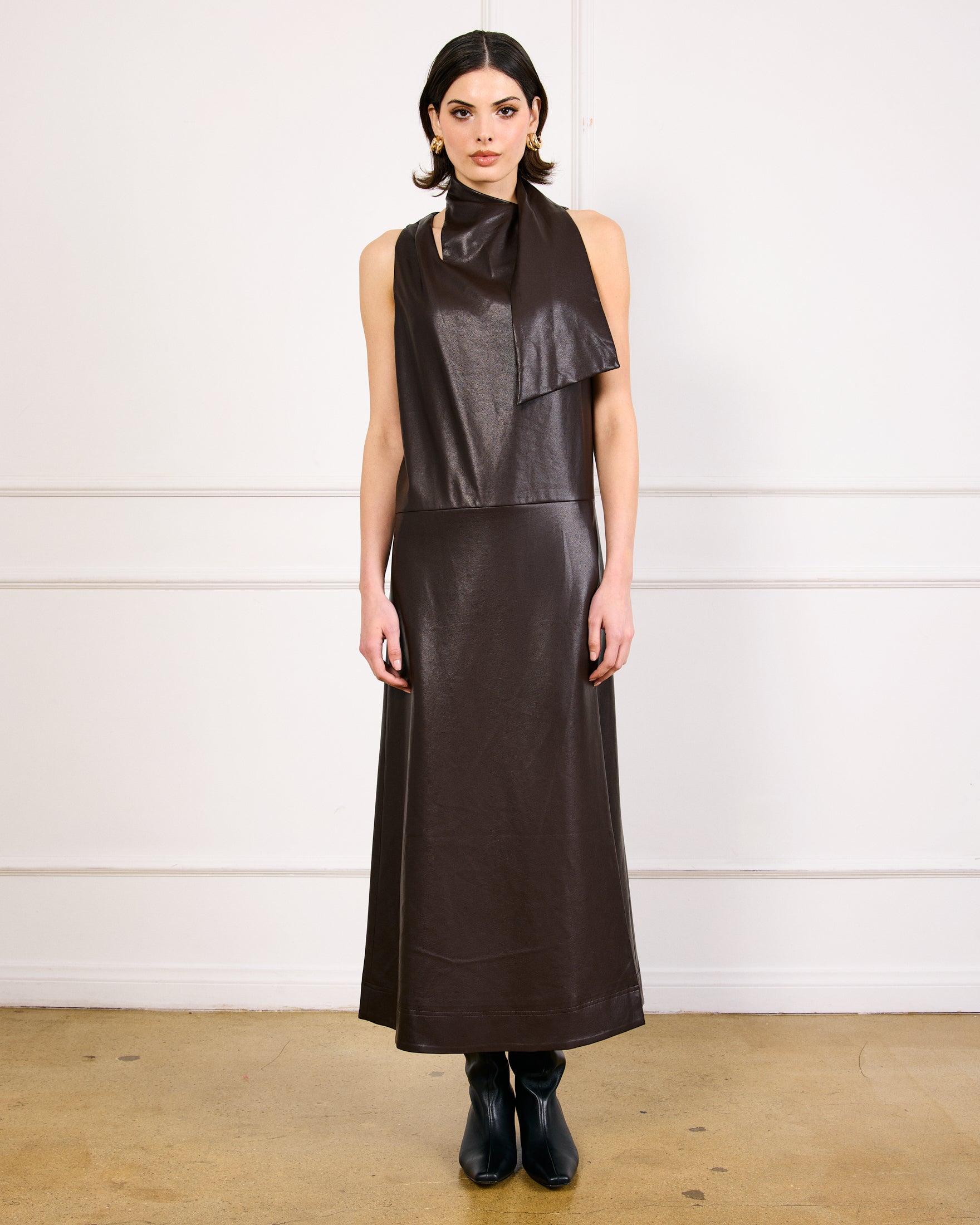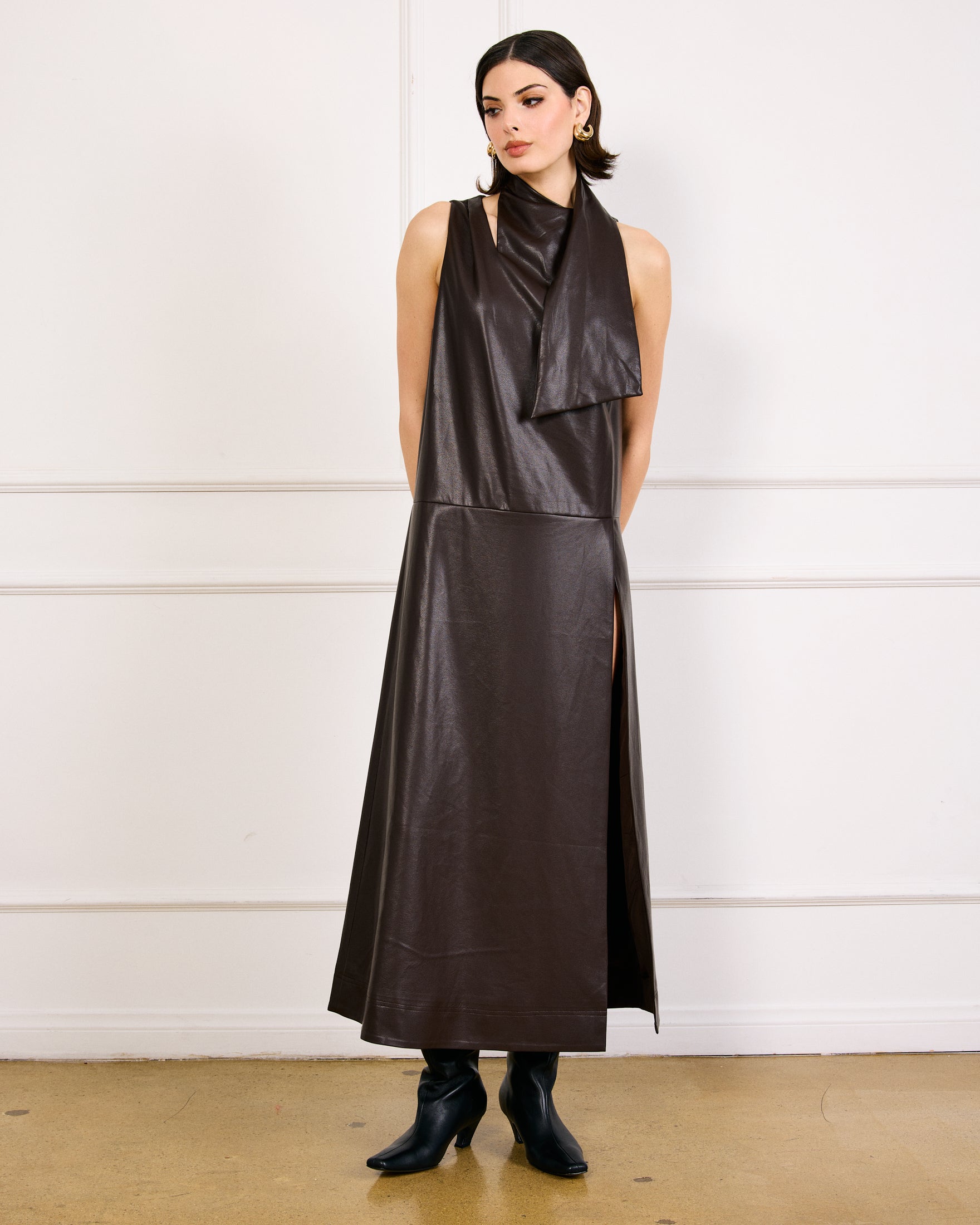 - Mid-weight faux leather fabric- Scarf detail along the neckline- Sleeveless- Hook-and-eye and hidden side zip - Fully lined