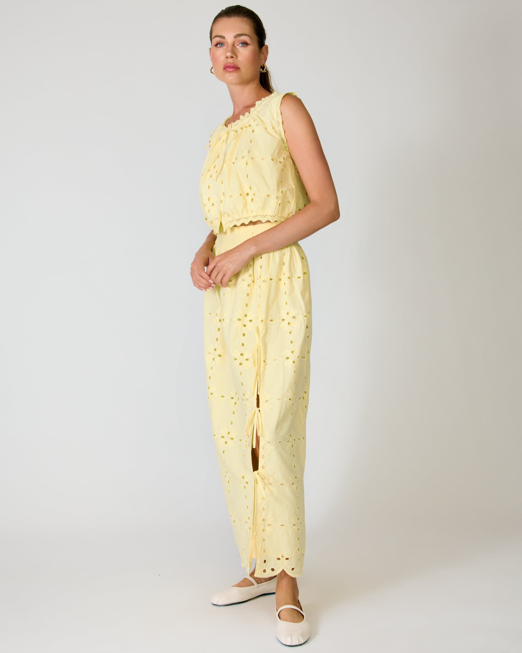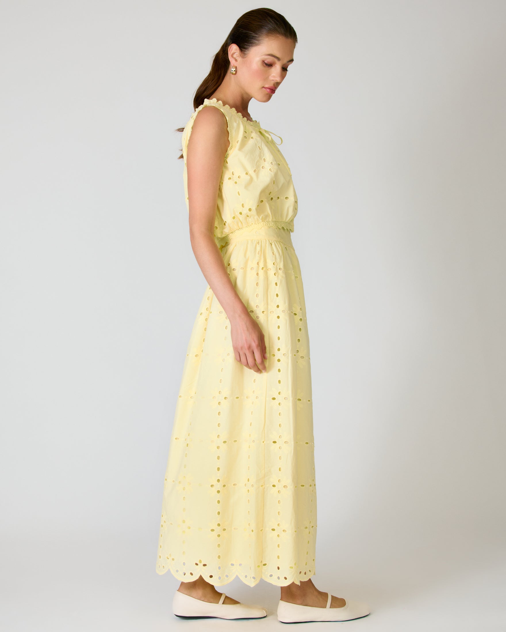 - Lightweight cotton eyelet lace fabric- Side slit with tied strings- Hook-and-eye and concealed side zipper- Fully lined