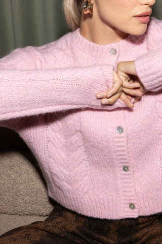 - Mid-weight knit sweater- Crewneck- Drop shoulder- Long sleeve- Front button placket