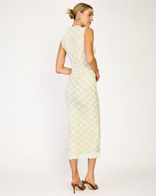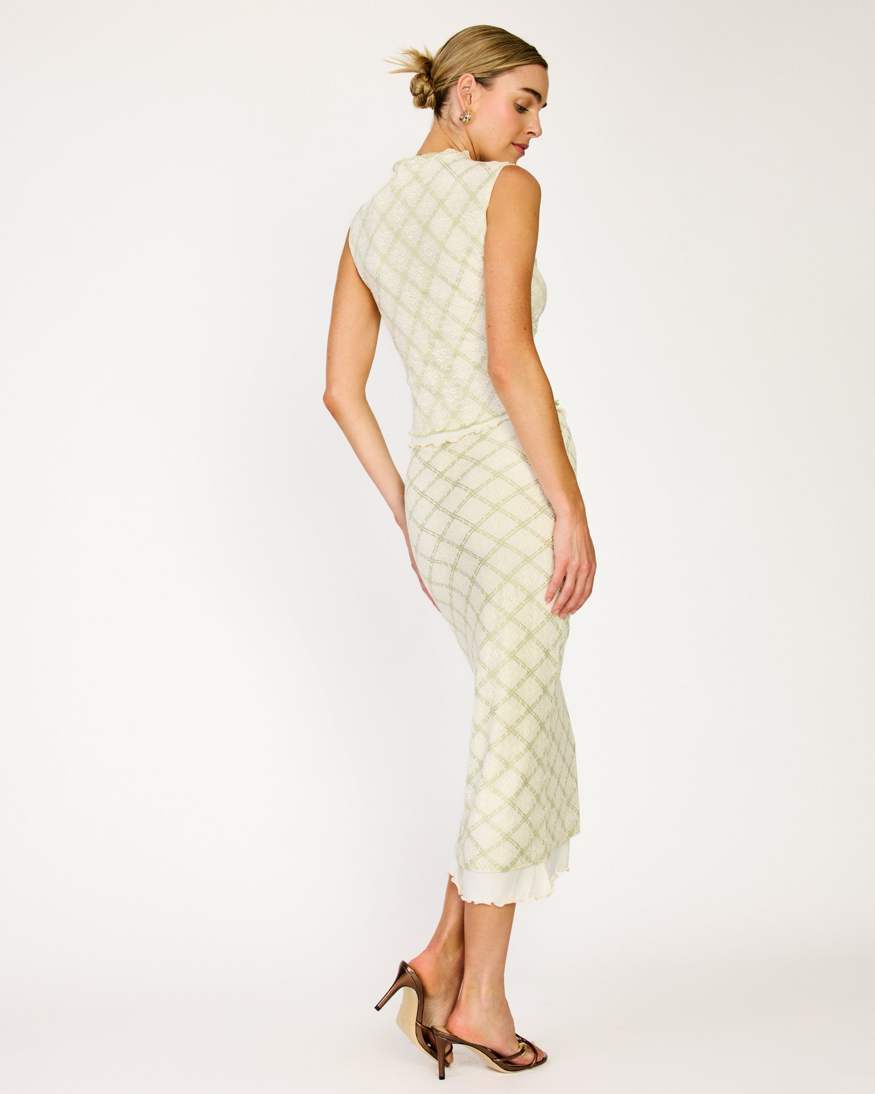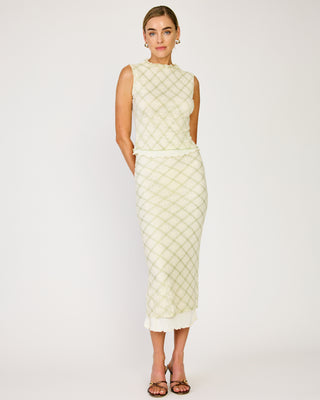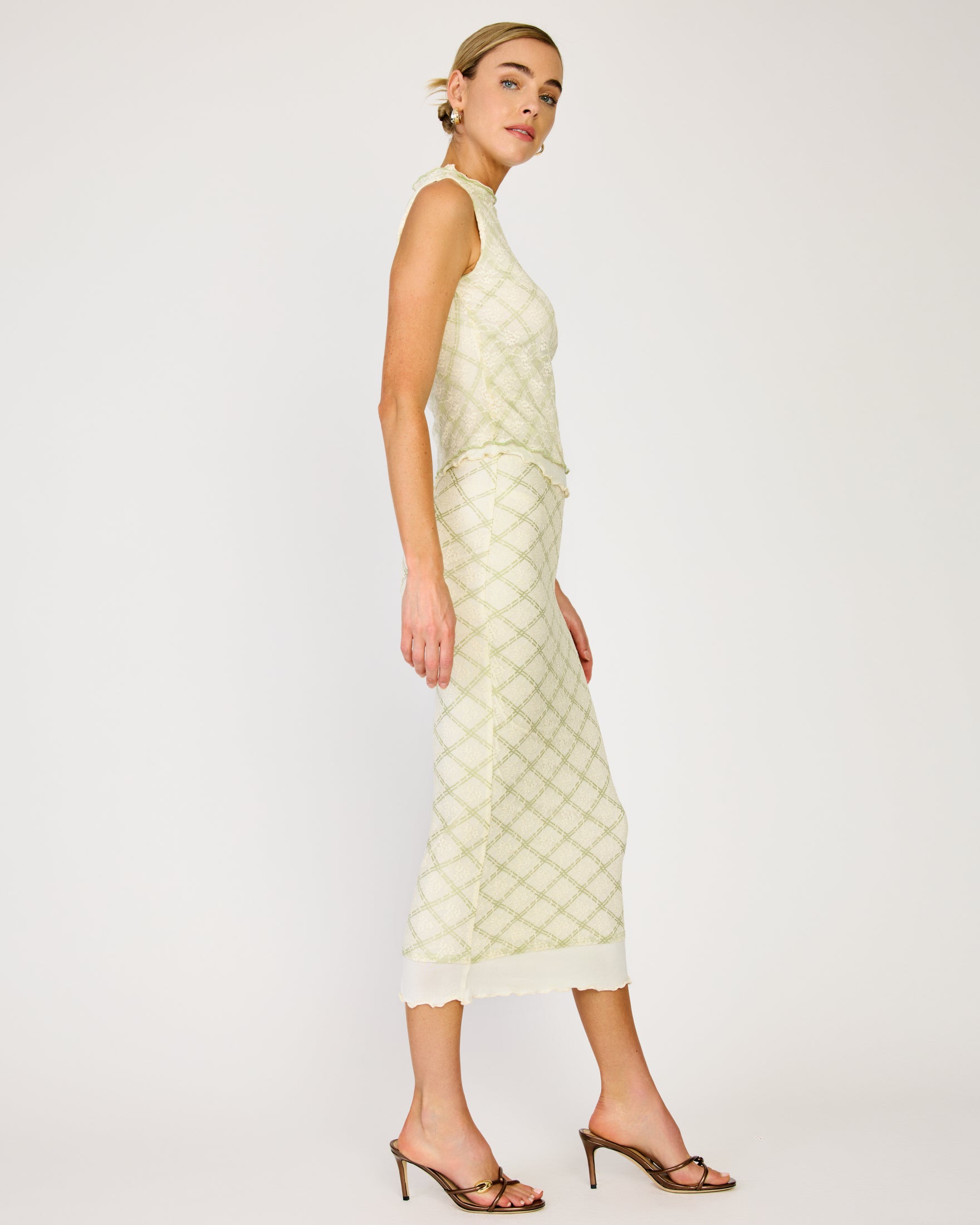 - Lightweight non-stretch lace fabric with plaid print- Elastic inserted waist- Hook-and-eye and hidden side zip- Lined with knit jersey fabric