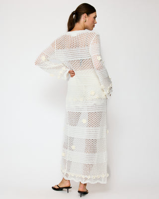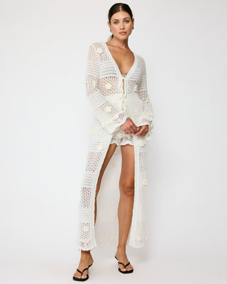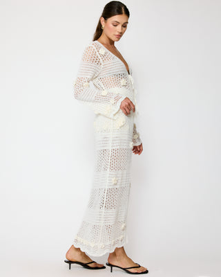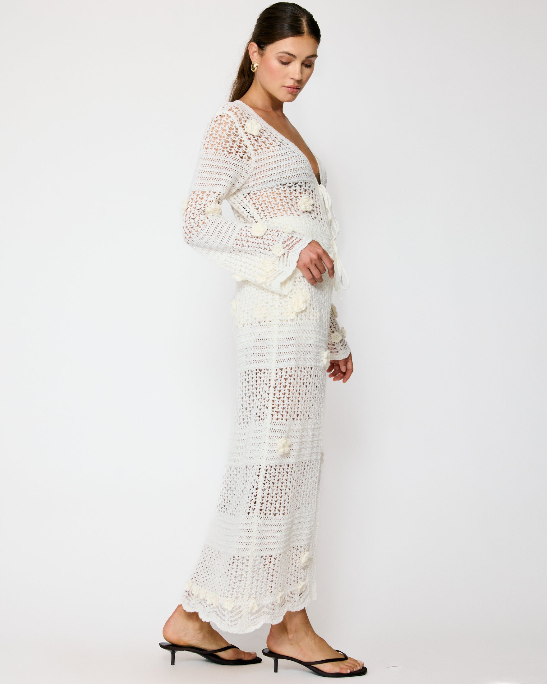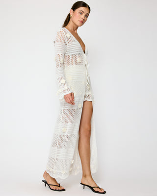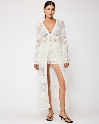 - Mid-weight crochet knitted fabric- Long sleeves- Floral applique detailed- Front tie- Unlined