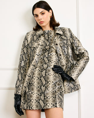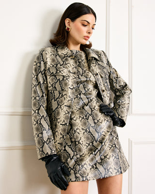 - Midweight, printed faux leather fabric - Collared neckline - Front button closure - Long sleeves - Fully lined