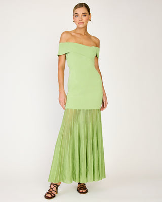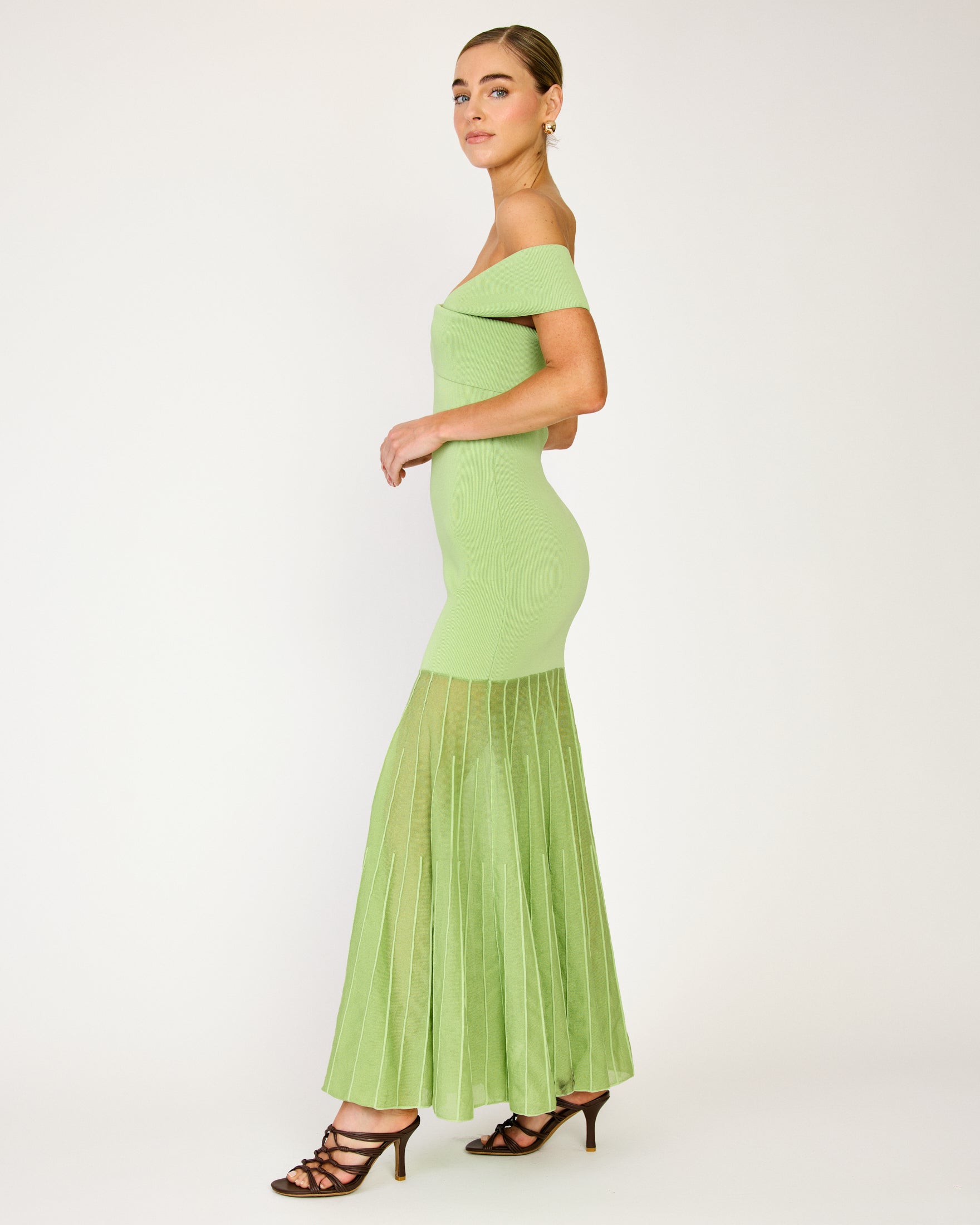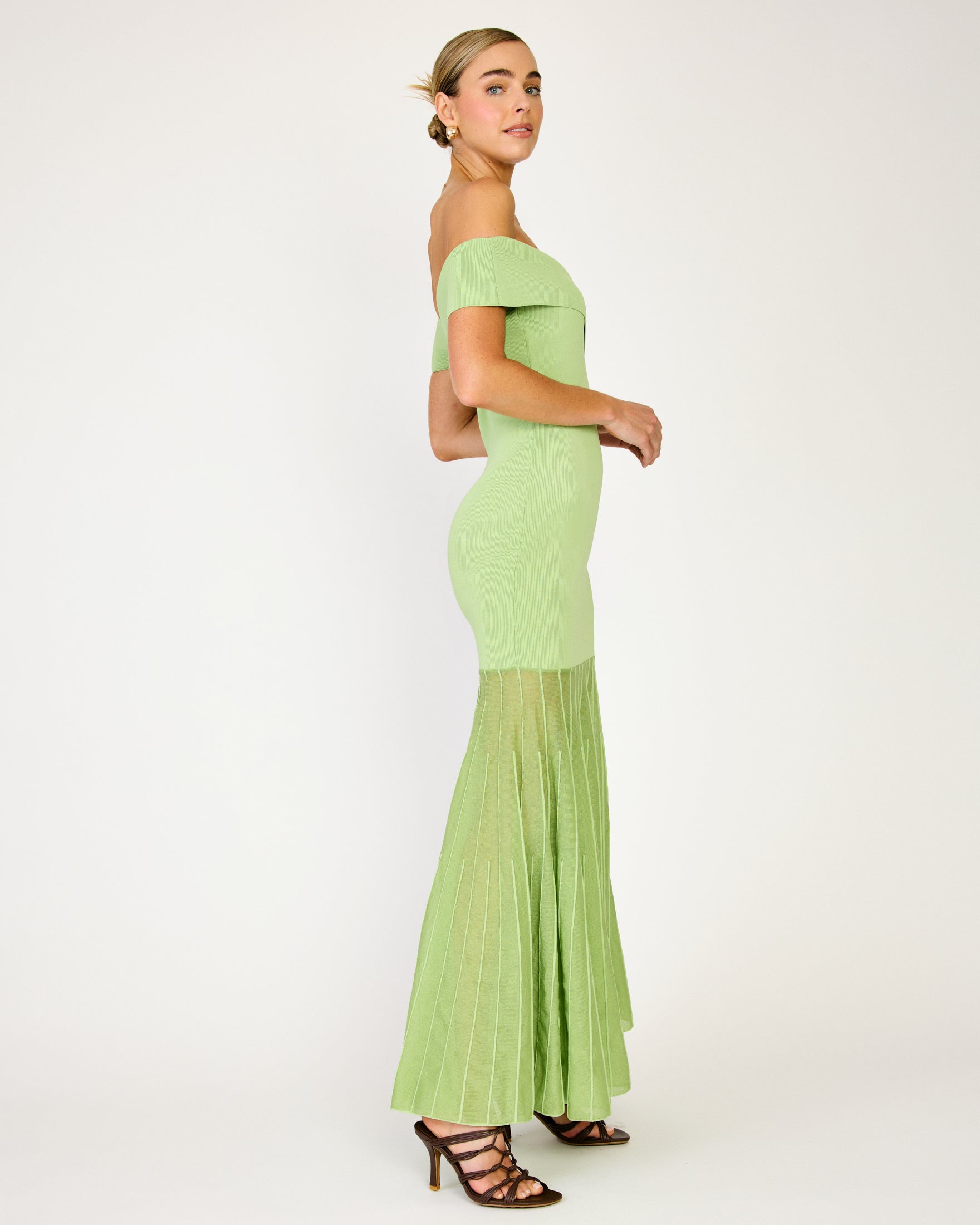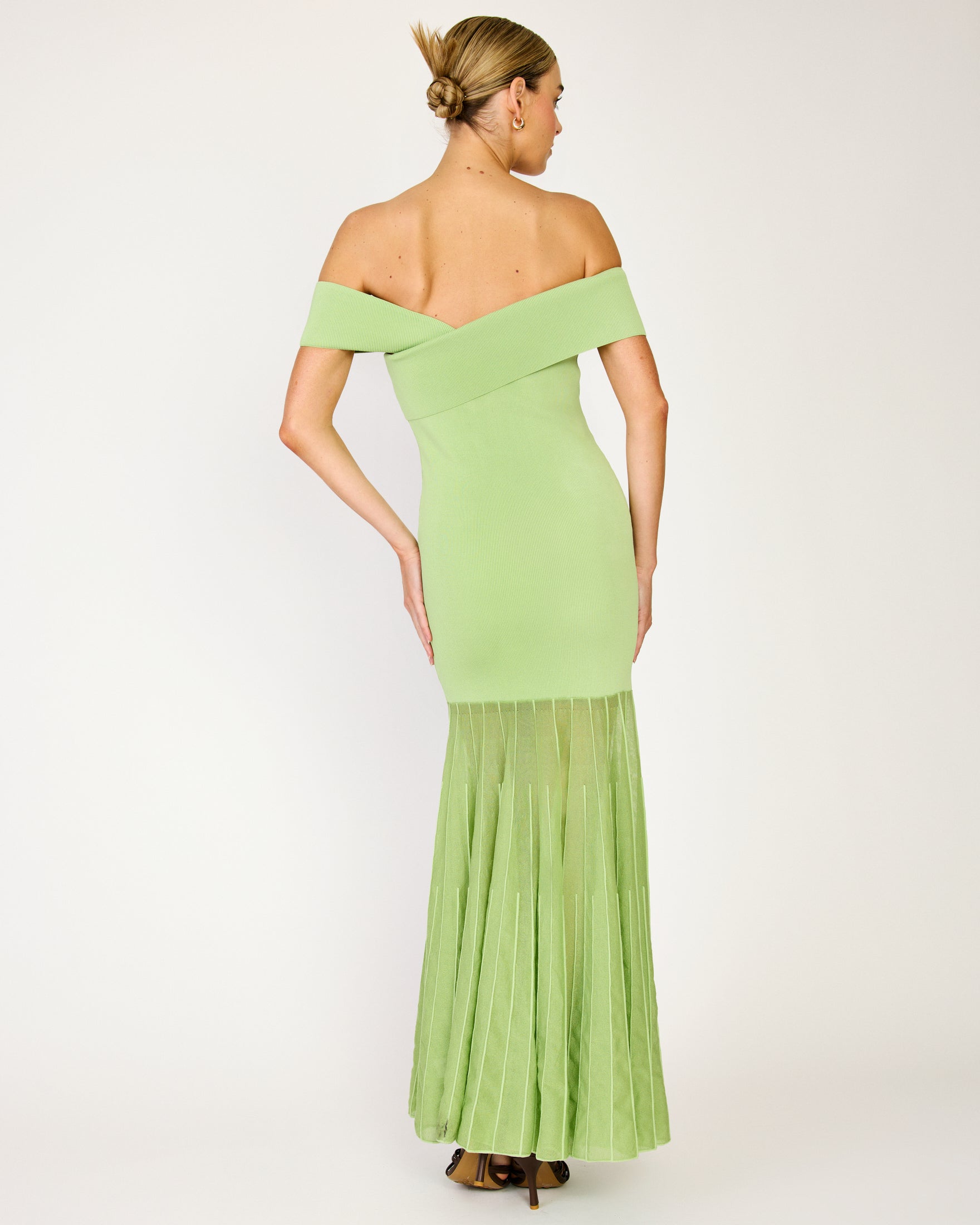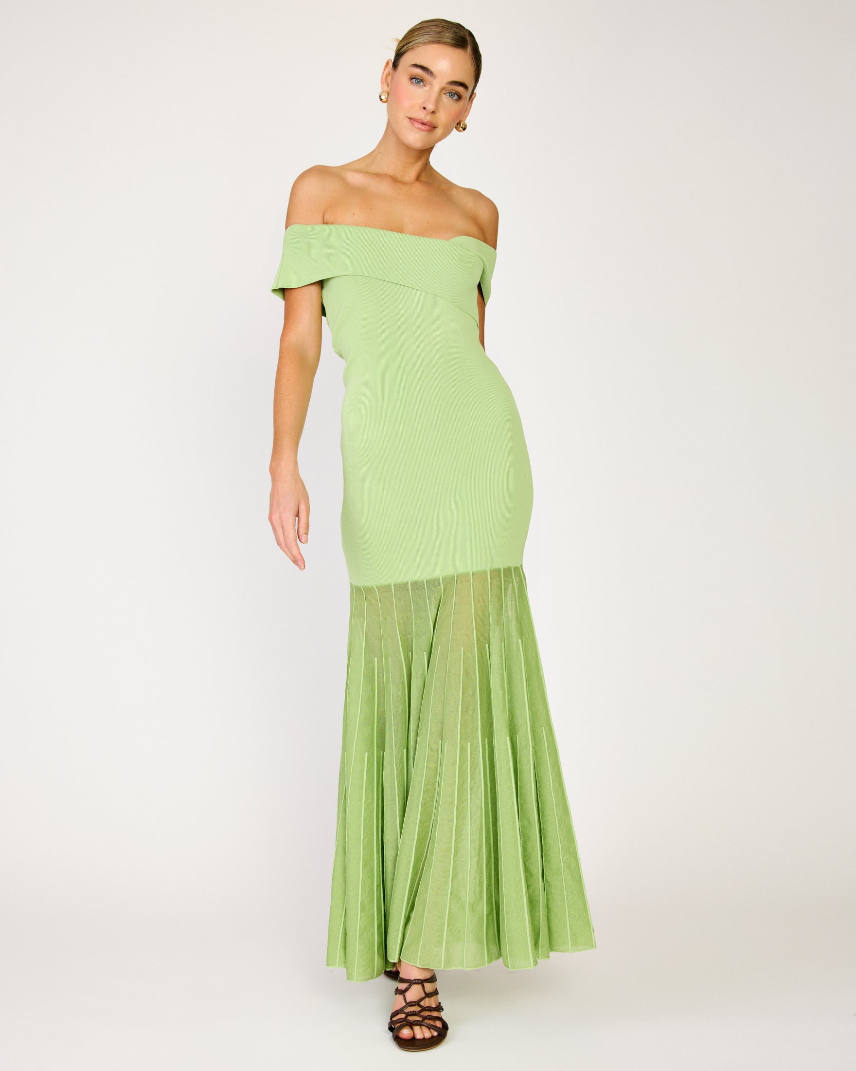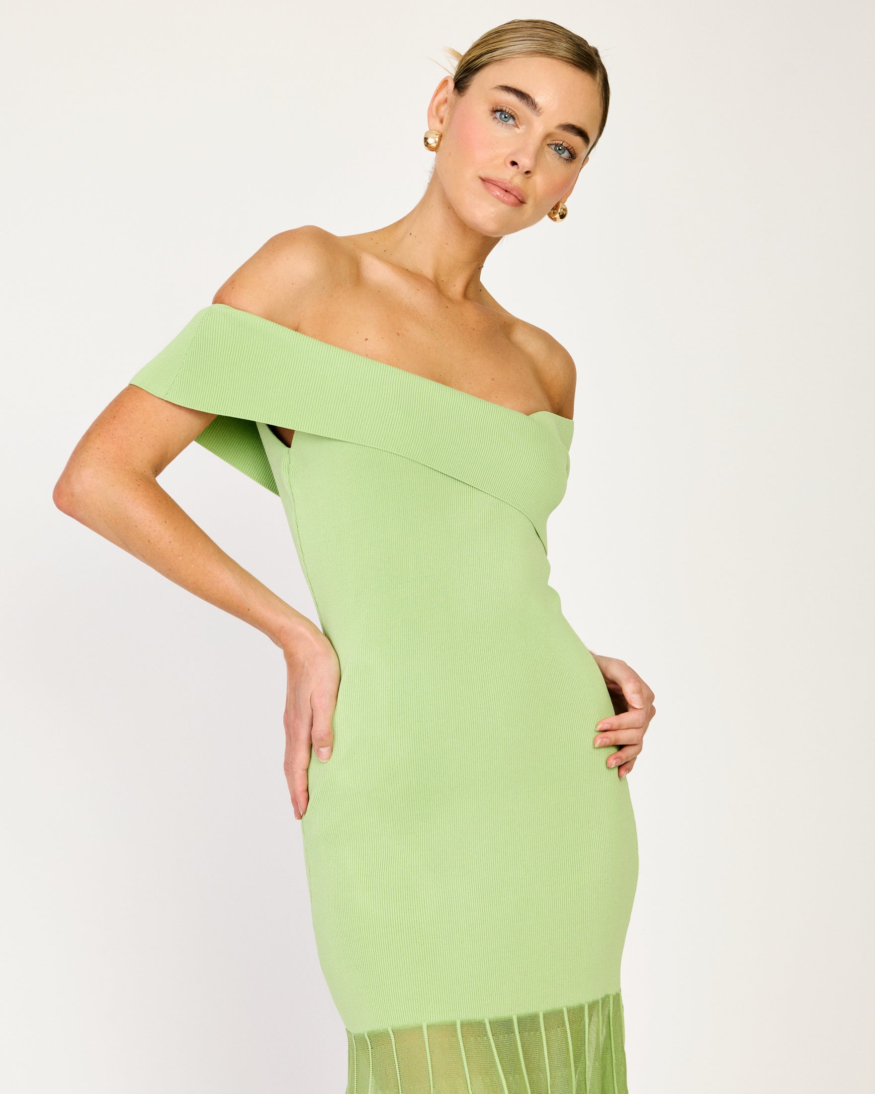 - Mid-weight knit sweater fabric - Semi-sheer skirt - Off-shoulder neckline - Pullover design, no closure
