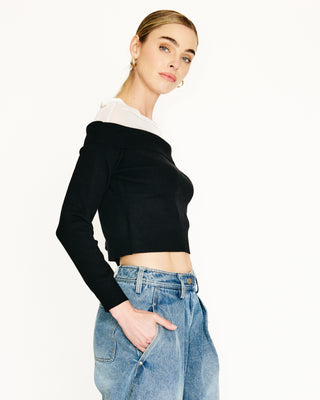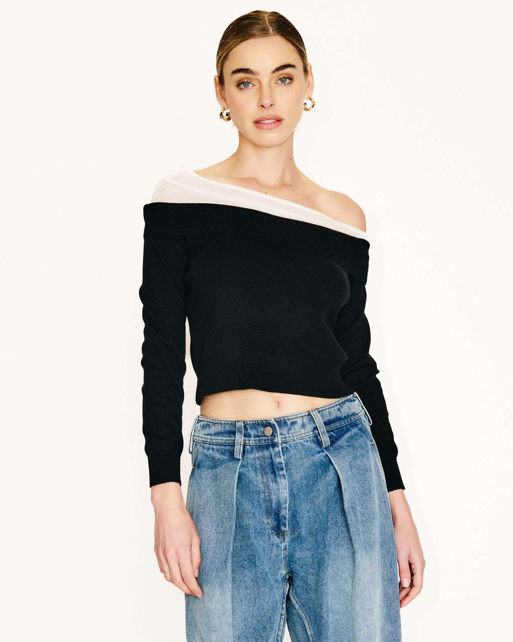- Mid-weight knit sweater fabric- Puff on design- Semi-sheer contrast detail - Off the shoulder design- Ribbed bottom opening and cuffs
